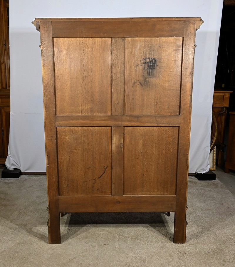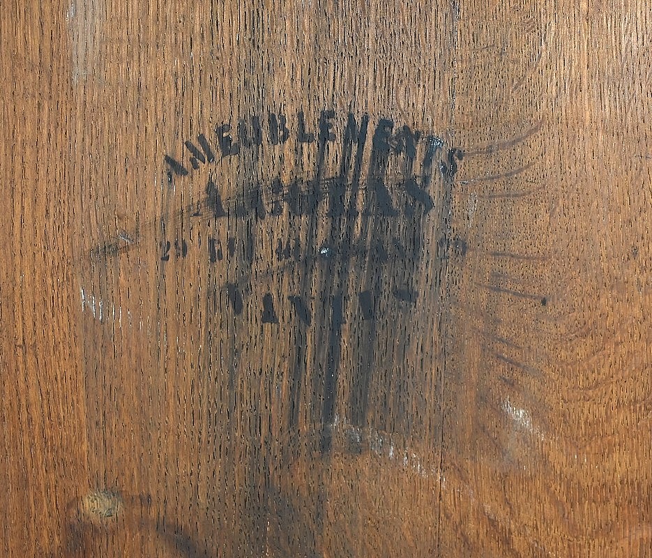 Les côtés du meubles sont lisses et le fond est en chêne, estampillé du magasin de meuble originel.