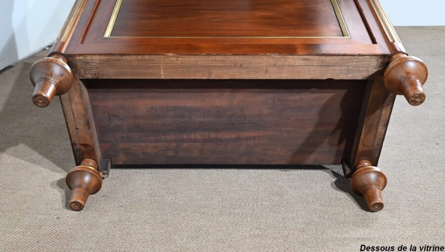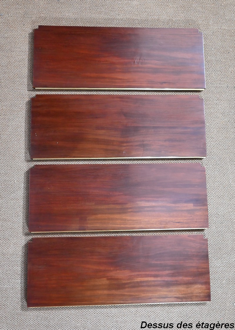 L’intérieur, entièrement en acajou, offre quatre étagères, réglables puisque sur crémaillères, et habillées d’un demi-rond en laiton sur leurs chants.