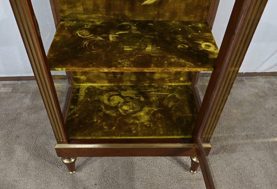 Petite vitrine toutes faces en acajou habillée de moulures en laiton. En effet, ses côtés et l’encadrement de la porte sont décorés de moulures à doucine en laiton. Les montants avec cannelures arrêtées sont également ornés de laiton. En partie haute, ils sont habillés de chutes figurant des flambeaux accompagnés de guirlandes de feuilles. En partie basse, ce meuble possède une plinthe agrémentée d’une large moulure laiton avec gorge et repose sur quatre pieds toupies équipés de sabots. En partie haute, la vitrine possède des plaques striées en façade. Au sommet, nous retrouvons un marbre Brèche Basque, entouré d’une galerie ajourée. La porte vitrée possède une entrée ciselée accompagnée de sa clé et d’une serrure d’origine en parfait état de fonctionnement. Cette vitrine est dotée d’un intérieur tapissé de velours vert scintillant garni de deux étagères.
