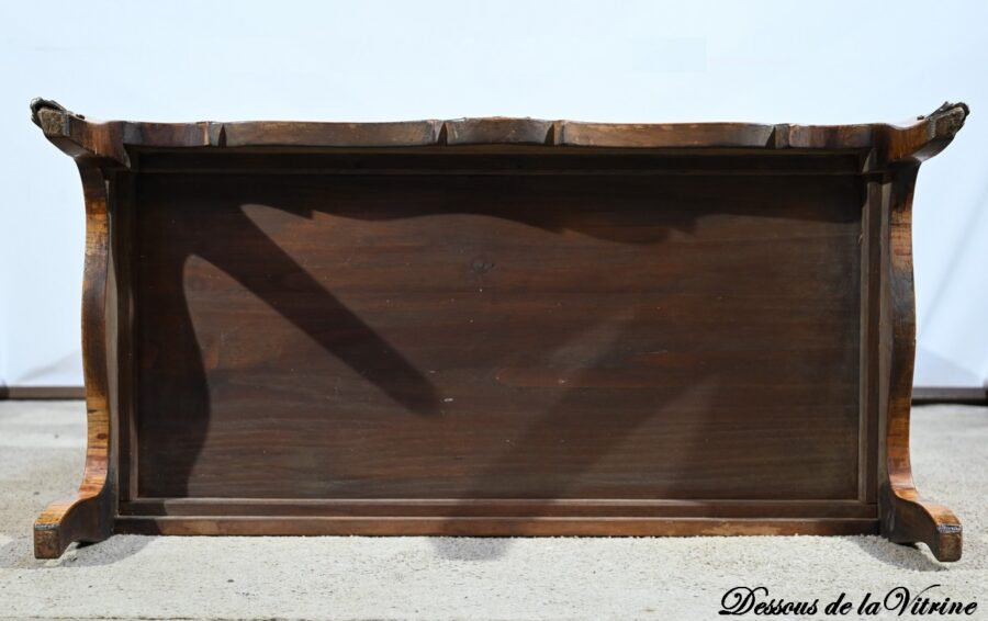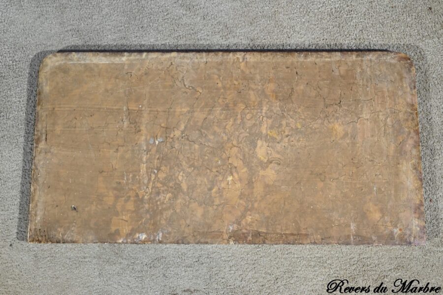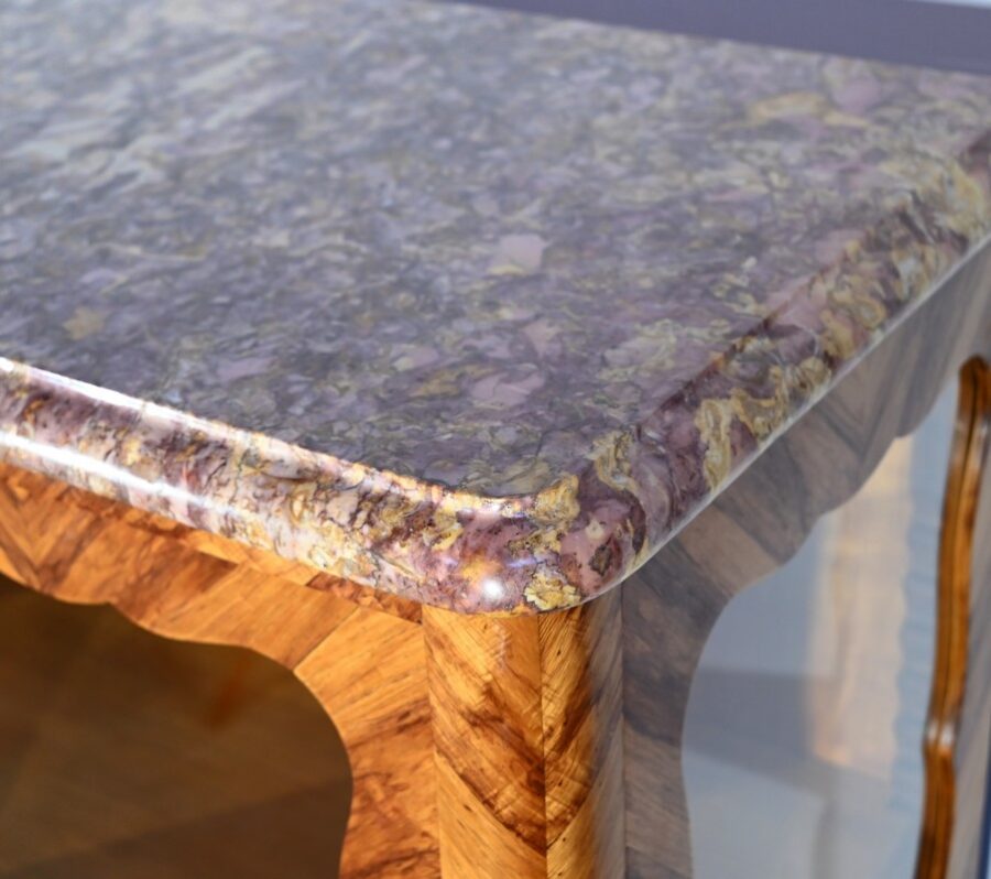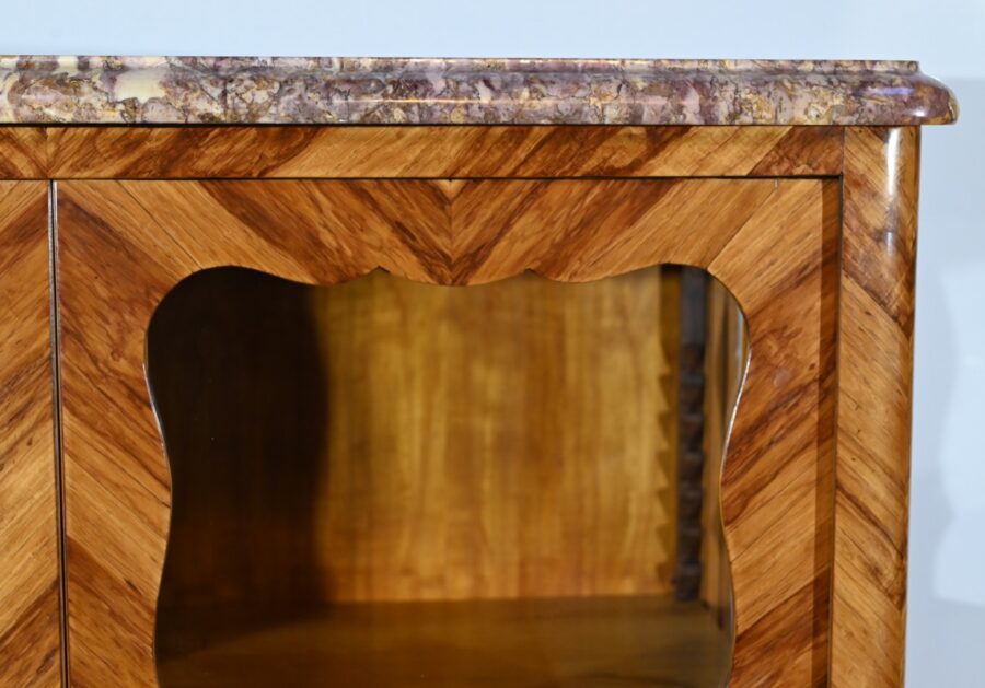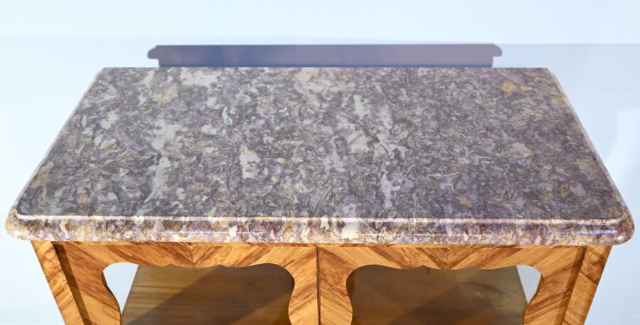Ce meuble est sommé d’un marbre brocatelle violette du Jura à bec-de-corbin.