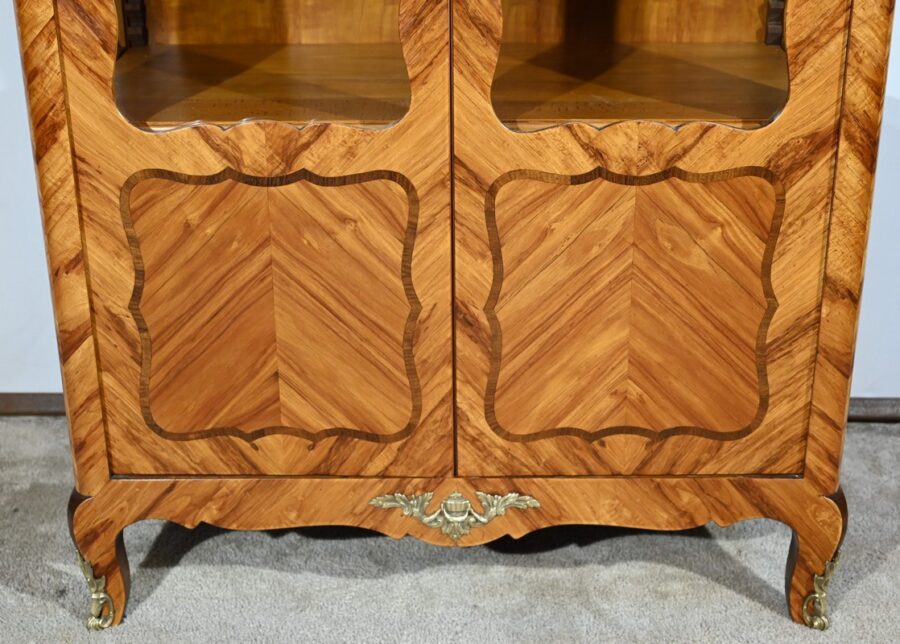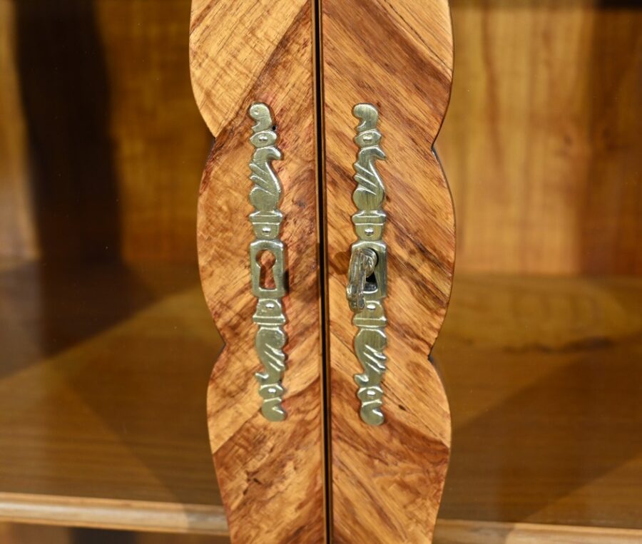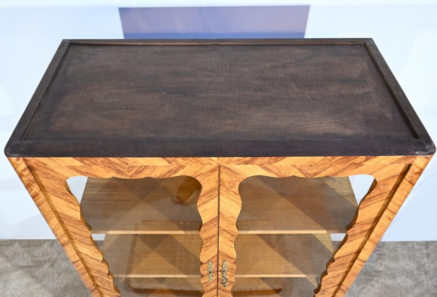Cette petite vitrine ouvre par deux portes vitrées aux deux tiers supérieurs, avec partie intérieure découpée, et munis d’une serrure haut et bas d’origine fonctionnelle avec entrées et clé.