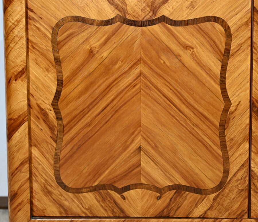 Chacune de ces deux portes présente, en partie inférieure, un panneau plaqué disposé en livre ouvert avec important filet de palissandre.