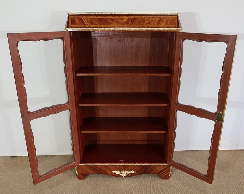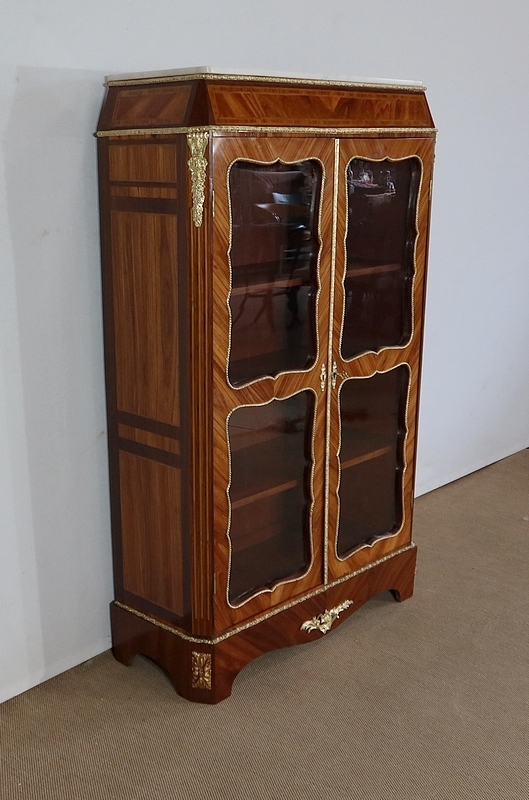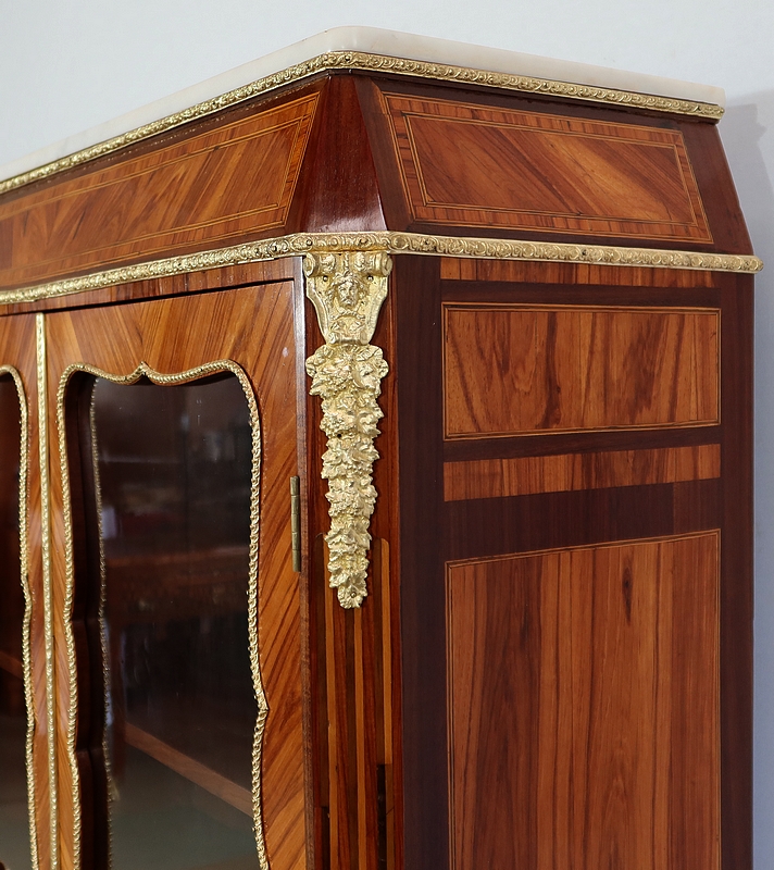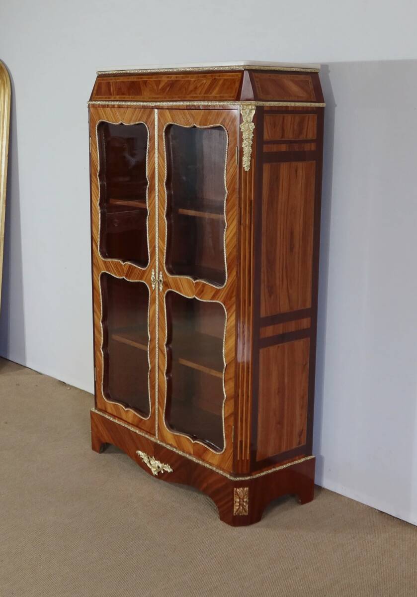 Rare Vitrine alliant marqueterie de bois de rose, de citronnier, d’amarante et d’acajou dans le goût Louis XIV.