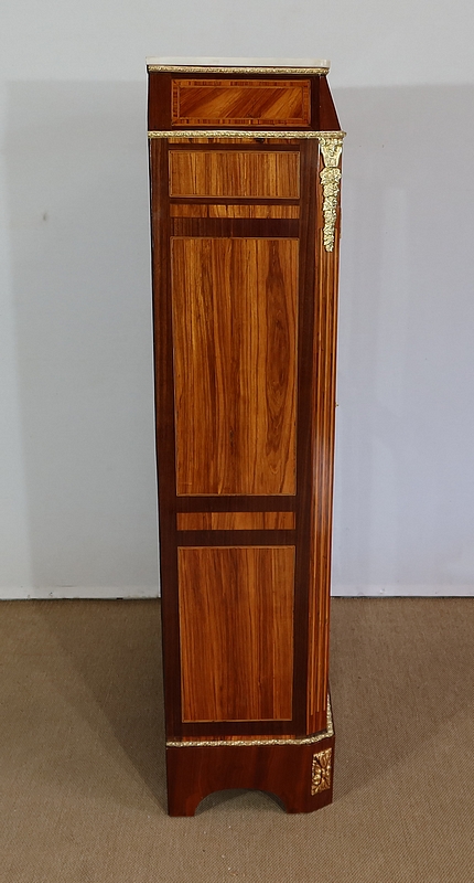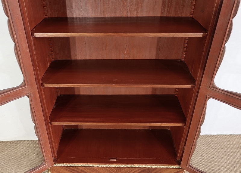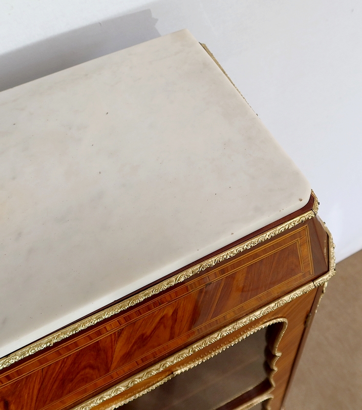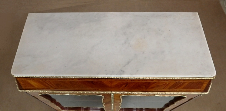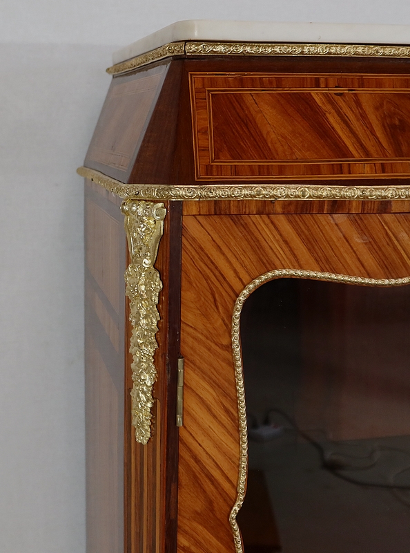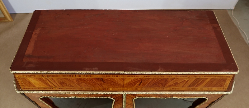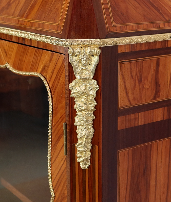 Ce mobilier raffiné ouvre par deux portes vitrées présentant un magnifique placage en frise de bois de rose. Une moulure en bronze ciselé et festonné entoure les vitres. Celles-ci, de taille identique, sont séparées par une traverse élégante. Ces portes légèrement découpées sont ornées en relief d’une moulure en bronze festonnée. Ces portes ouvrent par deux charnières en laiton. Au centre le couvre joint est en bronze avec un beau motif enrubanné.