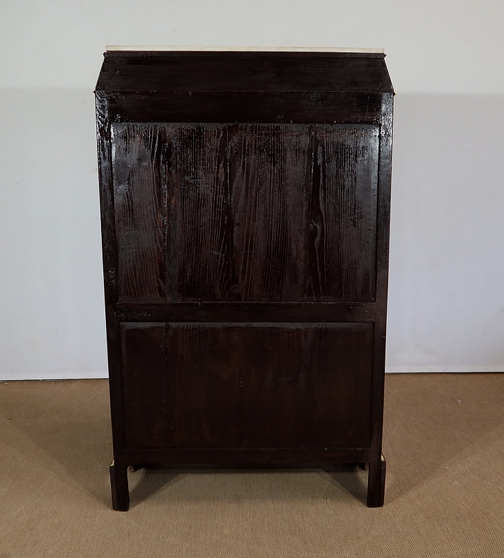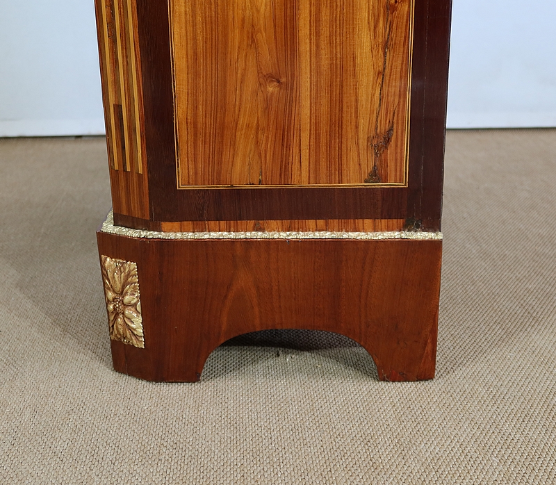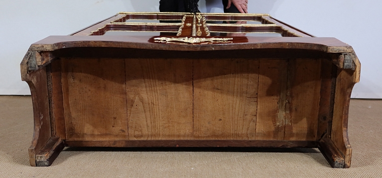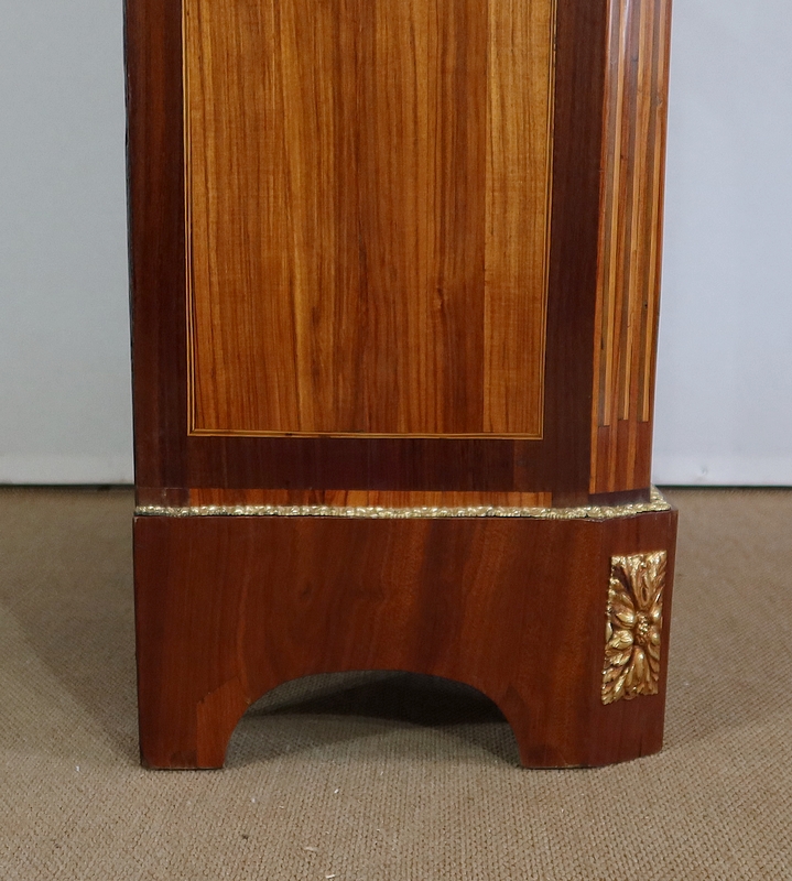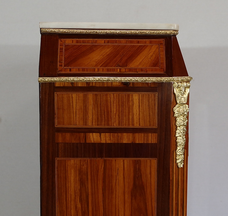 A l’identique la partie supérieure est soulignée de moulures en bronze finement ciselé et festonné. La partie fronton légèrement inclinée est composée de bois de rose en papillon, de filet citronnier et de bois teinté.