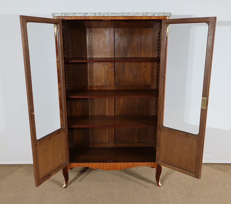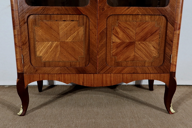 Ce meuble ouvre par deux portes vitrées au deux tiers et munie en partie basse d’un panneau en retrait en placage à 4 feuilles de bois de rose, entourés de filets de buis et de citronnier avec angles à la grecque.