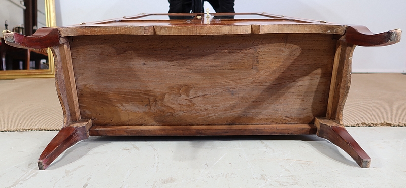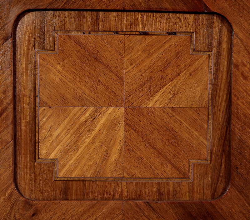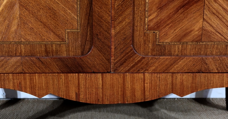 Les montants avant arrondis, en placage d’acajou horizontal agrémenté de filet de citronnier et se terminant par un pied bosse légèrement galbé en placage d’acajou. Sur la bosse de ce dernier nous retrouvons du bois clair incrusté puis des petits sabots en bronze. La partie haute du pied est ornementée d’une chute en bronze d’origine représentant un médaillon accompagné de feuillages.