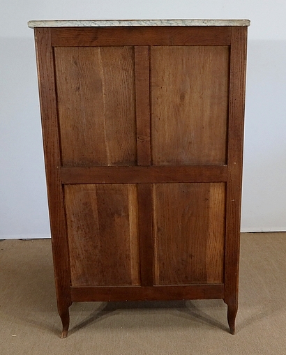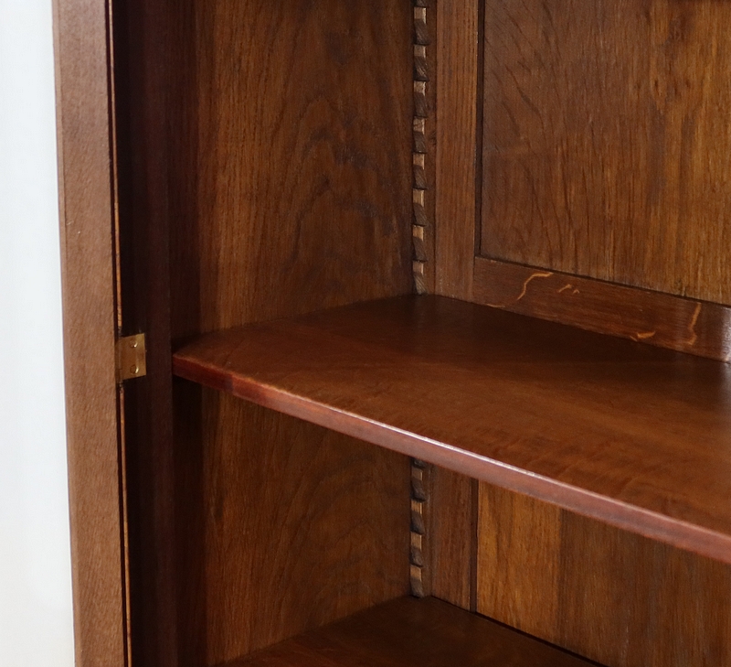 Ce mobilier raffiné renferme un intérieur garni de 3 étagères en chêne avec chant en acajou rouge, positionnées par tasseaux sur crémaillère installés sur 4 panneaux en chêne.