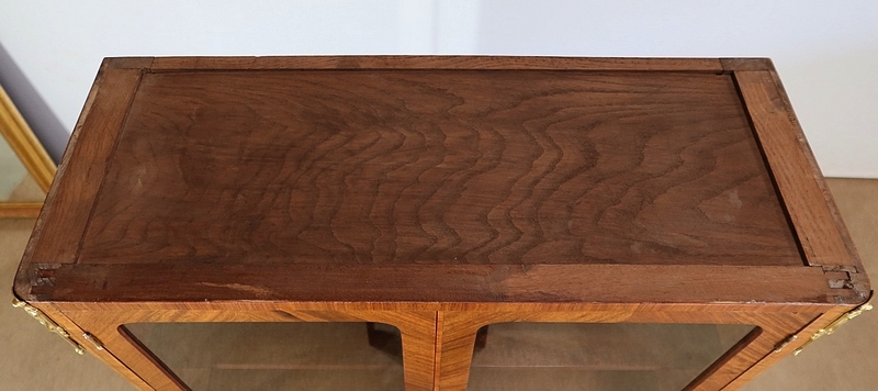 Cette vitrine possède des côtés dont la partie centrale est composée de placage d’acajou en chevron entouré de filet de bois clair, de bois teinté et d’une autre bande d’acajou.