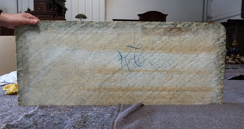 Son dessus est un magnifique marbre pyrénéen Vert d’Estours, nuancé et délicatement veiné entouré d’une fine gorge.