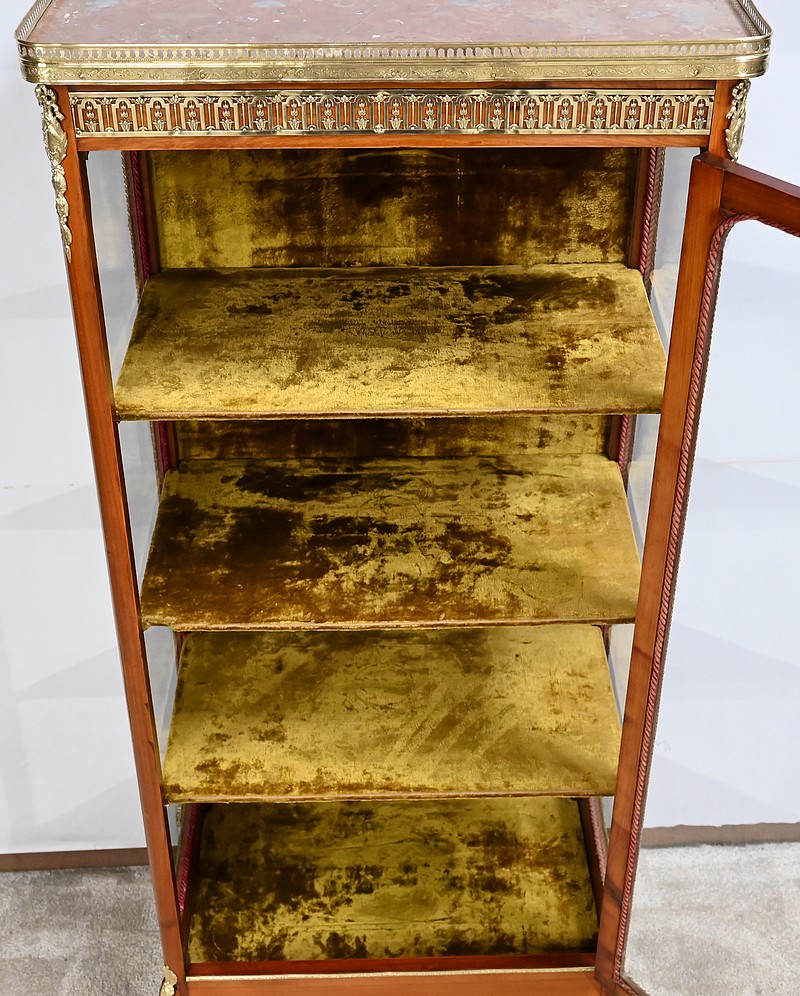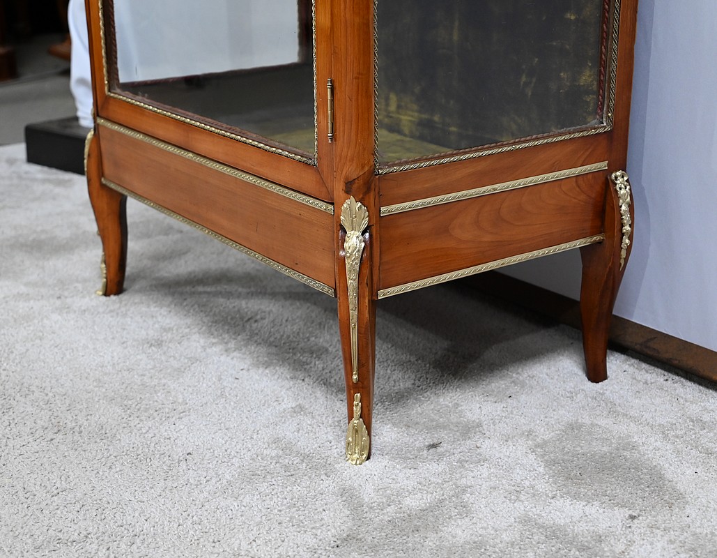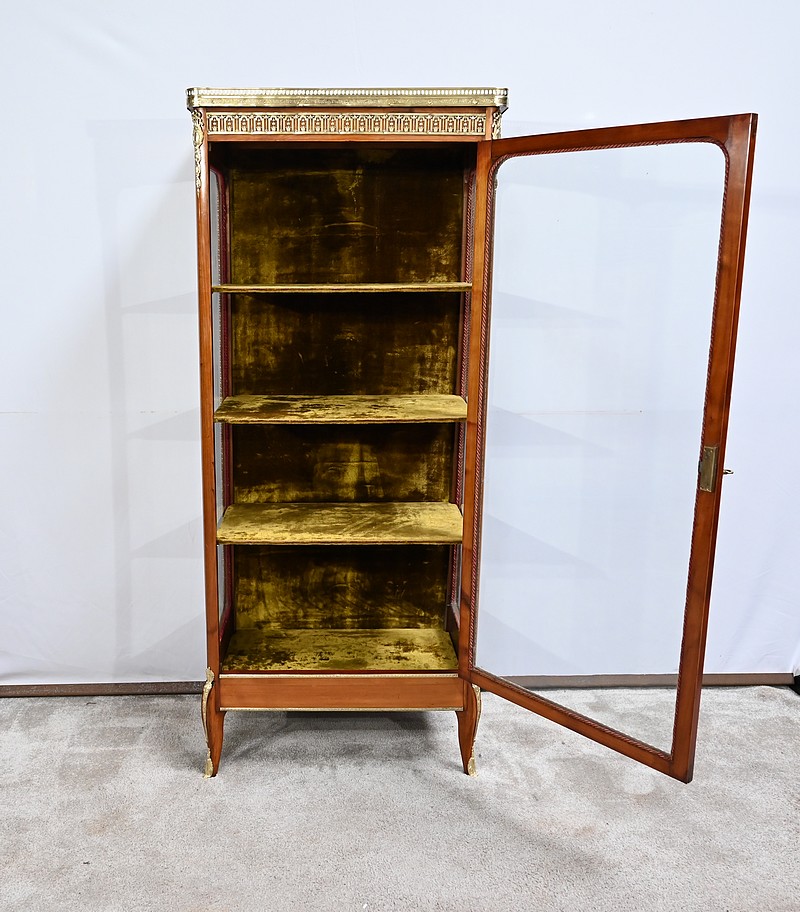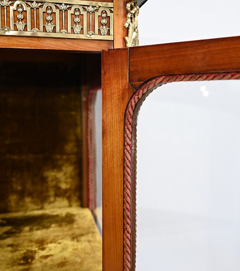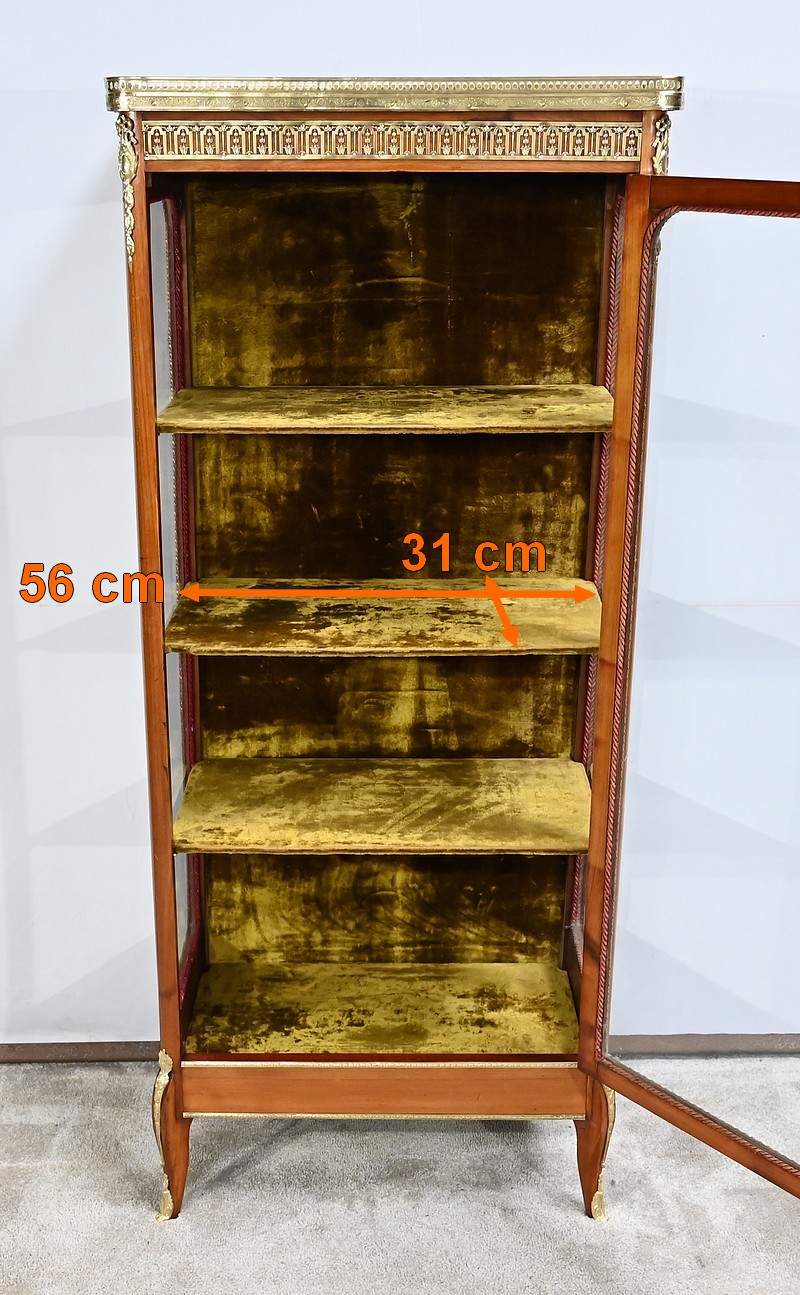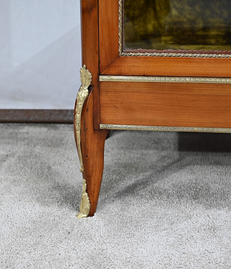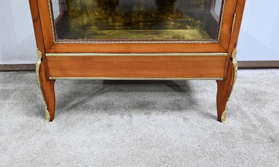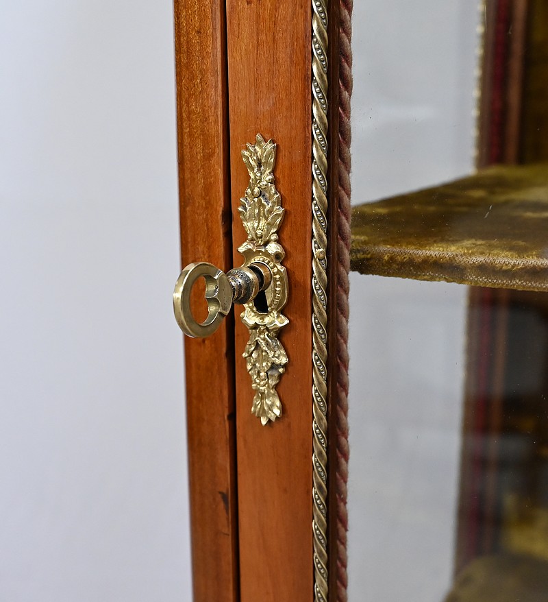 Ce meuble est composé d’une porte dont le cadre est à coupe d’onglet avec en partie intérieure une baguette en bronze festonné. Cette porte est foncée d’une vitre et s’ouvre sur des paumelles en laiton. La serrure d’origine et la clé sont en état de fonctionnement et la longue entrée en bronze souligne le passage de la clé. Les montants en merisier massif sont légèrement arrondis et se terminent en partie basse par un pied sabot avec léger mouvement à bosse décoré de bronze et un sabot. La partie haute quant à elle est habillée d’un bronze avec ruban et chute.
