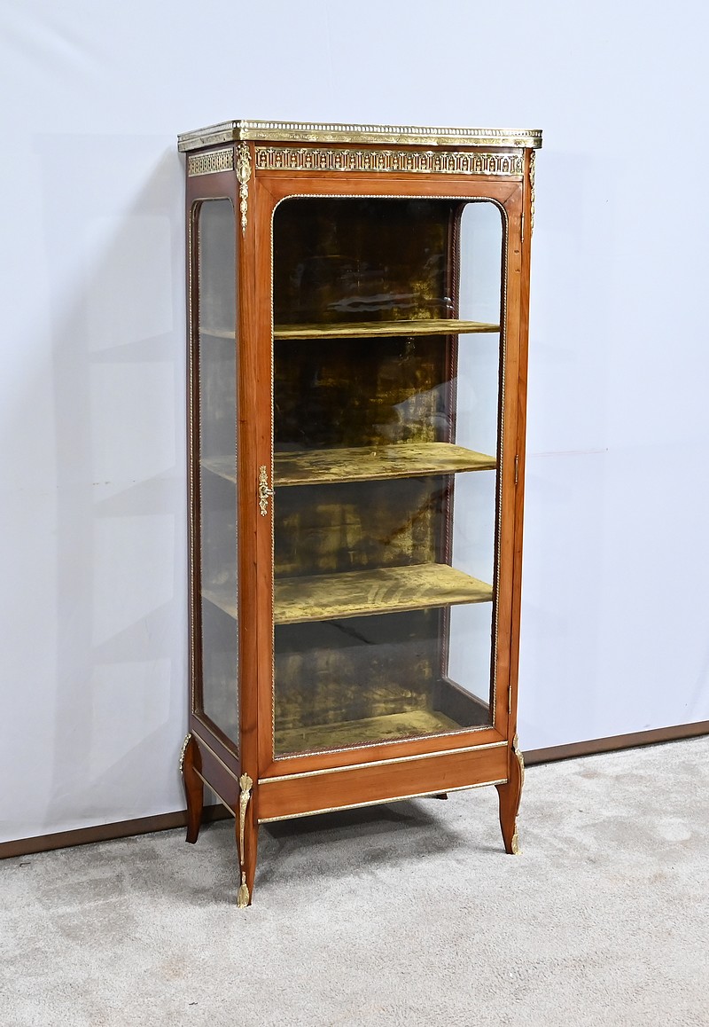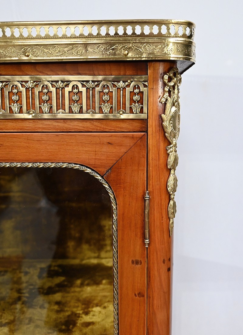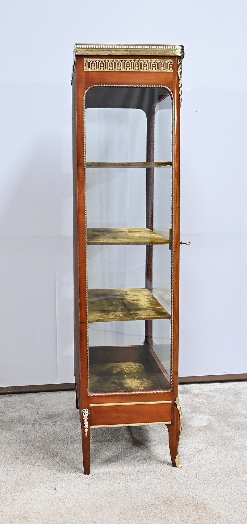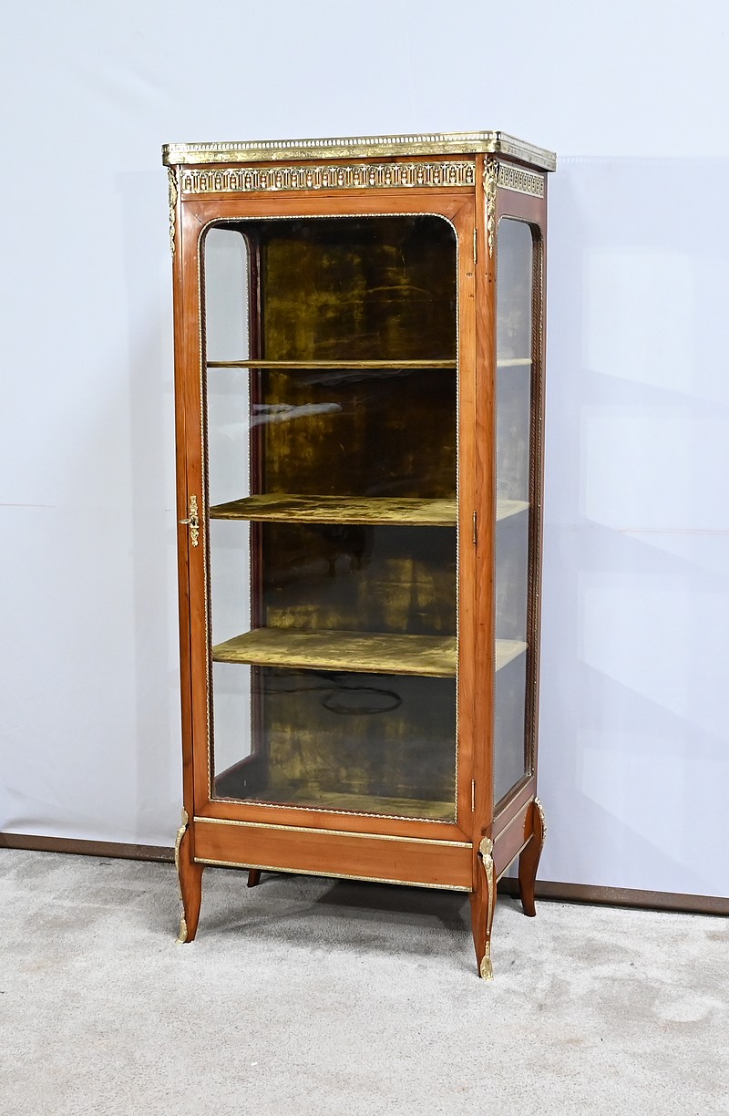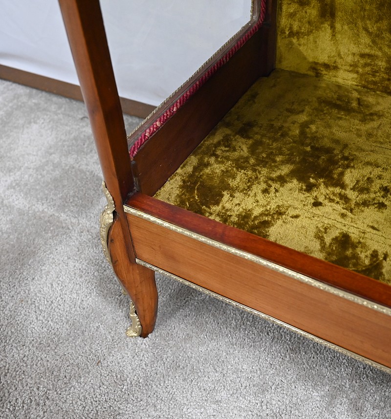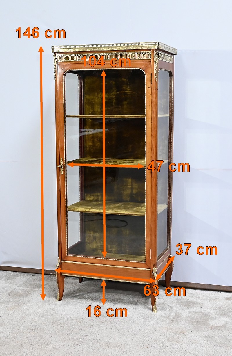 Ce meuble est composé d’une porte dont le cadre est à coupe d’onglet avec en partie intérieure une baguette en bronze festonné. Cette porte est foncée d’une vitre et s’ouvre sur des paumelles en laiton. La serrure d’origine et la clé sont en état de fonctionnement et la longue entrée en bronze souligne le passage de la clé. Les montants en merisier massif sont légèrement arrondis et se terminent en partie basse par un pied sabot avec léger mouvement à bosse décoré de bronze et un sabot. La partie haute quant à elle est habillée d’un bronze avec ruban et chute.