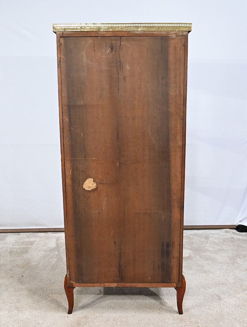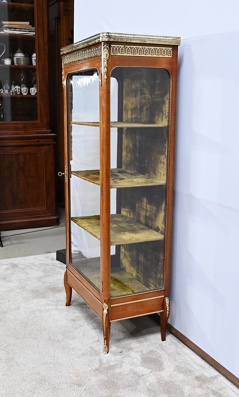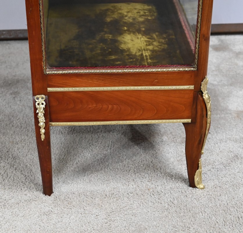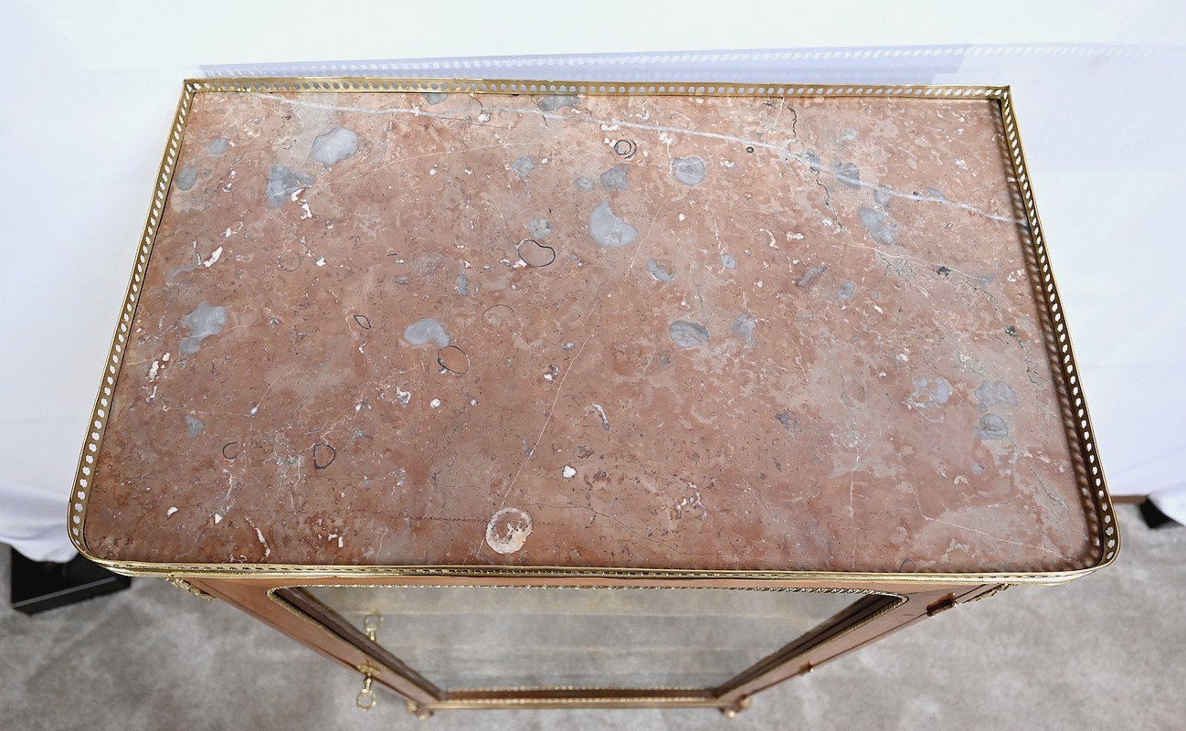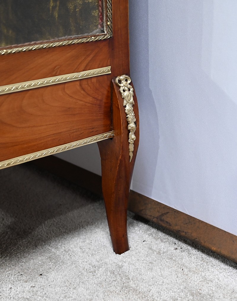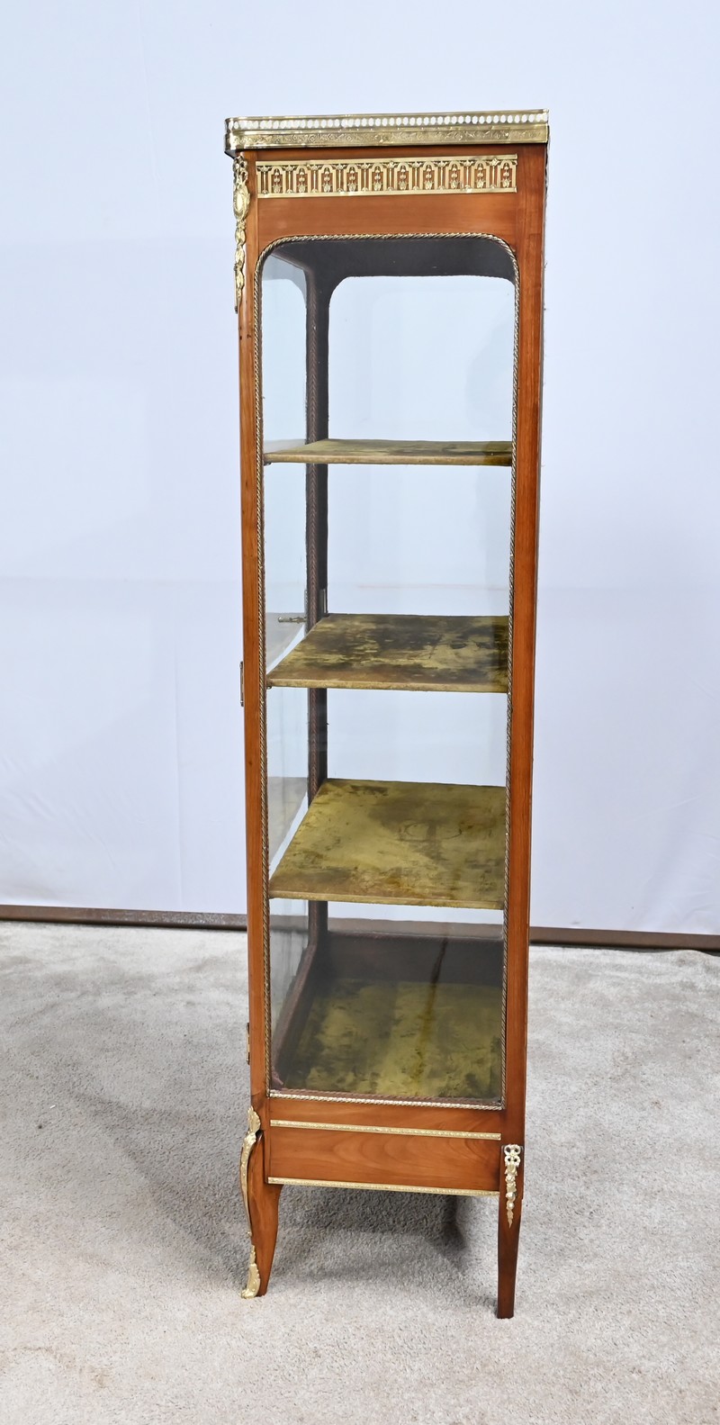 Ce meuble est composé d’une porte dont le cadre est à coupe d’onglet avec en partie intérieure une baguette en bronze festonné. Cette porte est foncée d’une vitre et s’ouvre sur des paumelles en laiton. La serrure d’origine et la clé sont en état de fonctionnement et la longue entrée en bronze souligne le passage de la clé. Les montants en merisier massif sont légèrement arrondis et se terminent en partie basse par un pied sabot avec léger mouvement à bosse décoré de bronze et un sabot. La partie haute quant à elle est habillée d’un bronze avec ruban et chute.