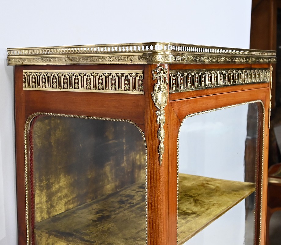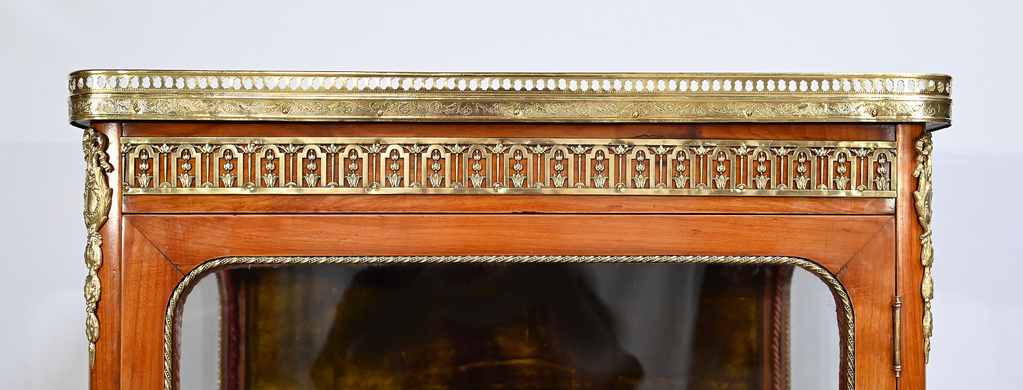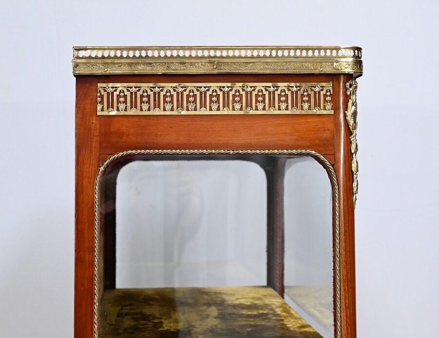 La traverse haute de cette vitrine est garnie d’un élément de laiton ajouré composés de motifs répétitifs figurant des fleurs stylisées.