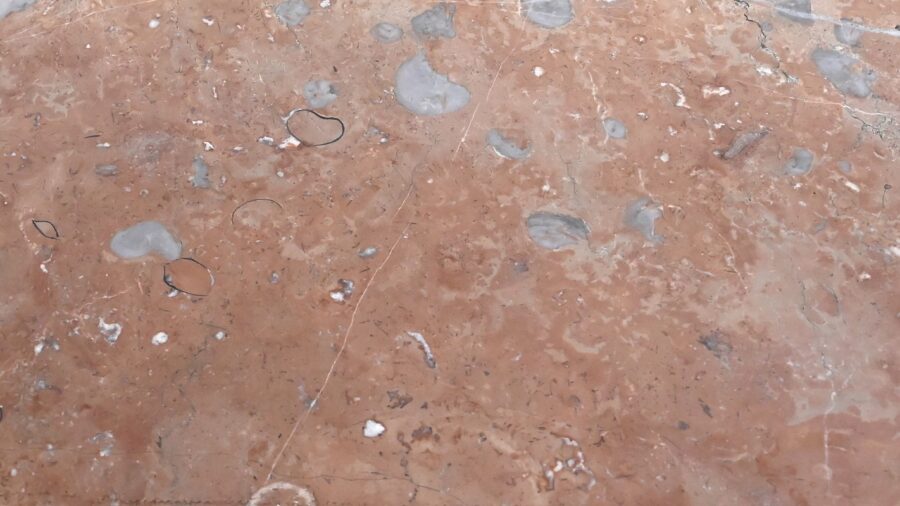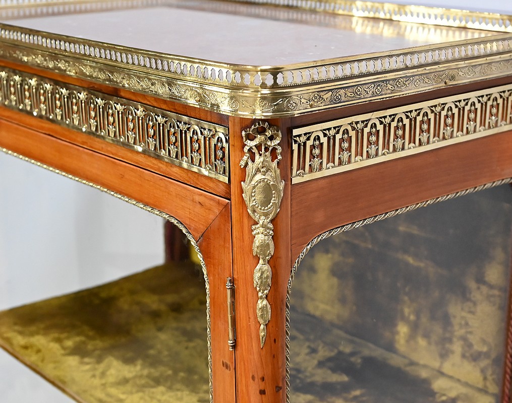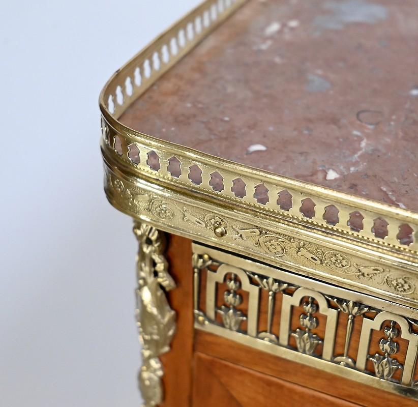 Au sommet, nous retrouvons un beau marbre rose orange Varois, entouré d’une galerie ajourée et festonnée.