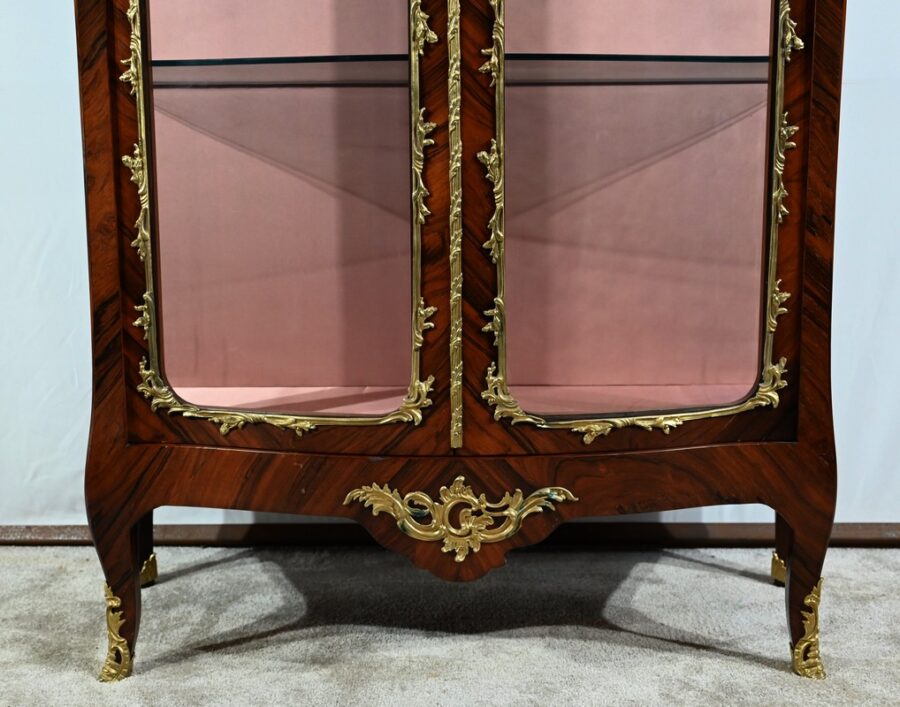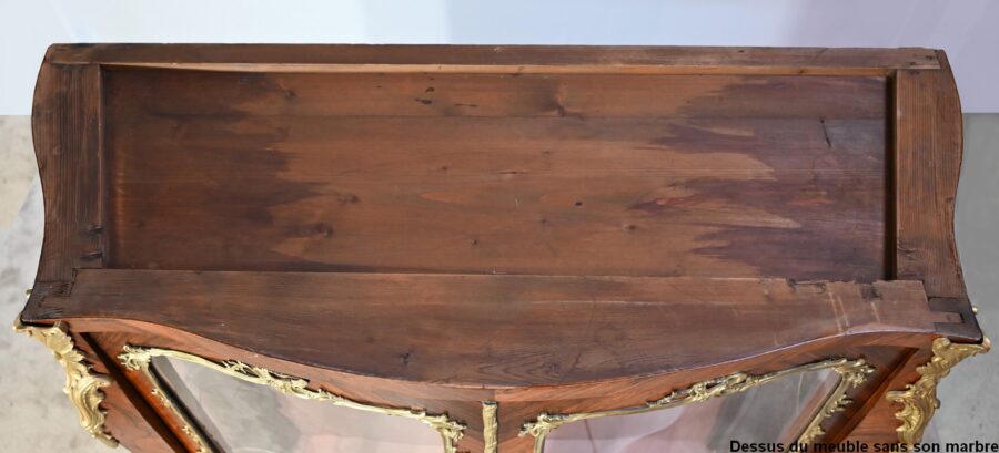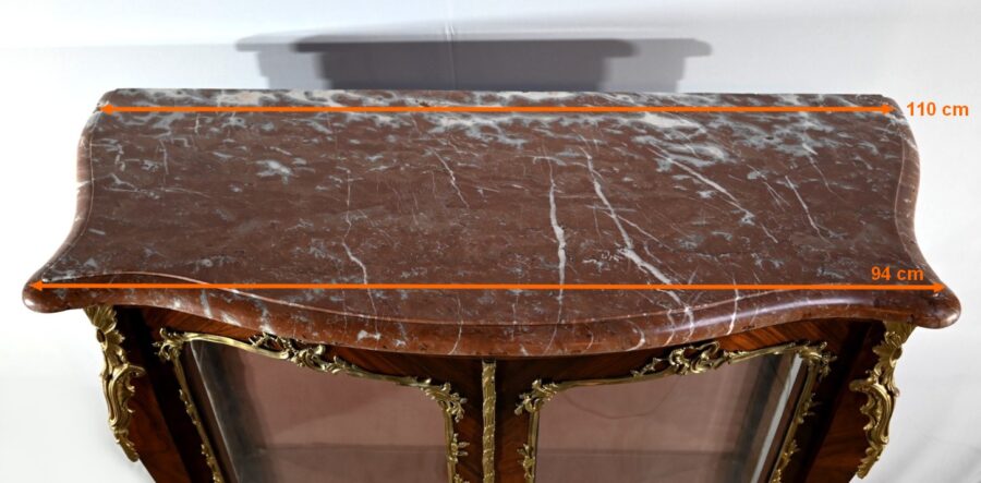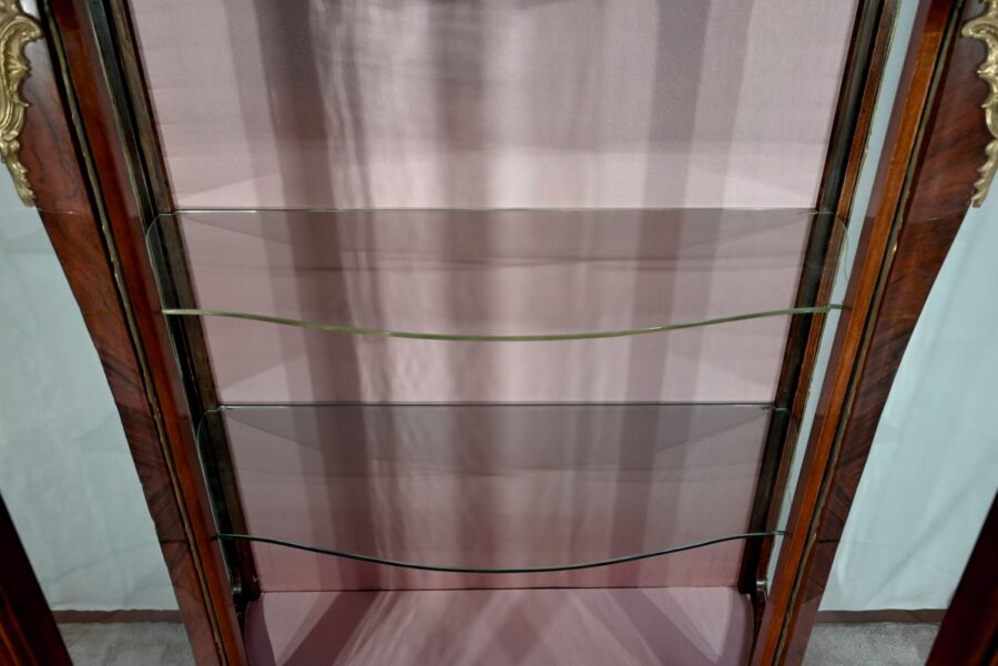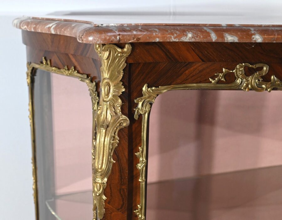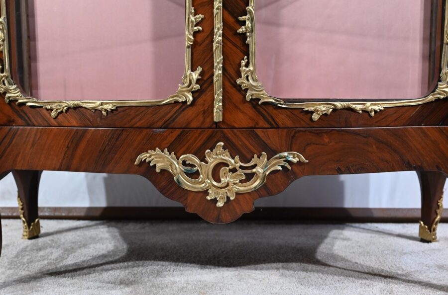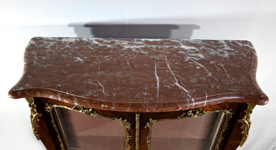 Cette vitrine, sommée d’un marbre rouge des Pyrénées à ressaut et à bec-de-corbin, ouvre par deux portes vitrées légèrement convexes. Leurs encadrements sont en placage de palissandre disposé en diagonale. Ces portes sont munies d’une serrure fonctionnelle d’origine avec clé et entrées laiton finement ouvragées. En façade et sur les côtés, chacune des vitres est soulignée dans son pourtour par une garniture en applique composée de volutes, de pommes de pin et de rinceaux en bronze doré.
