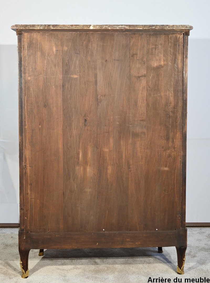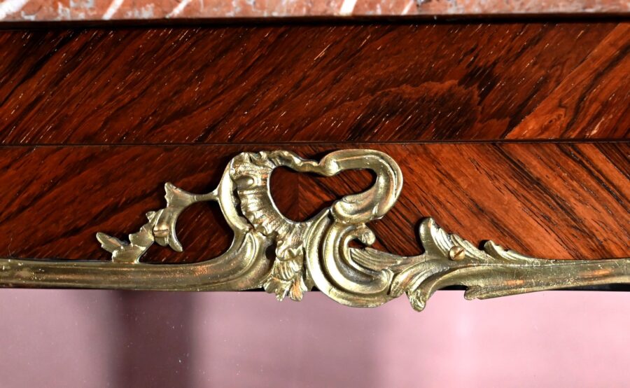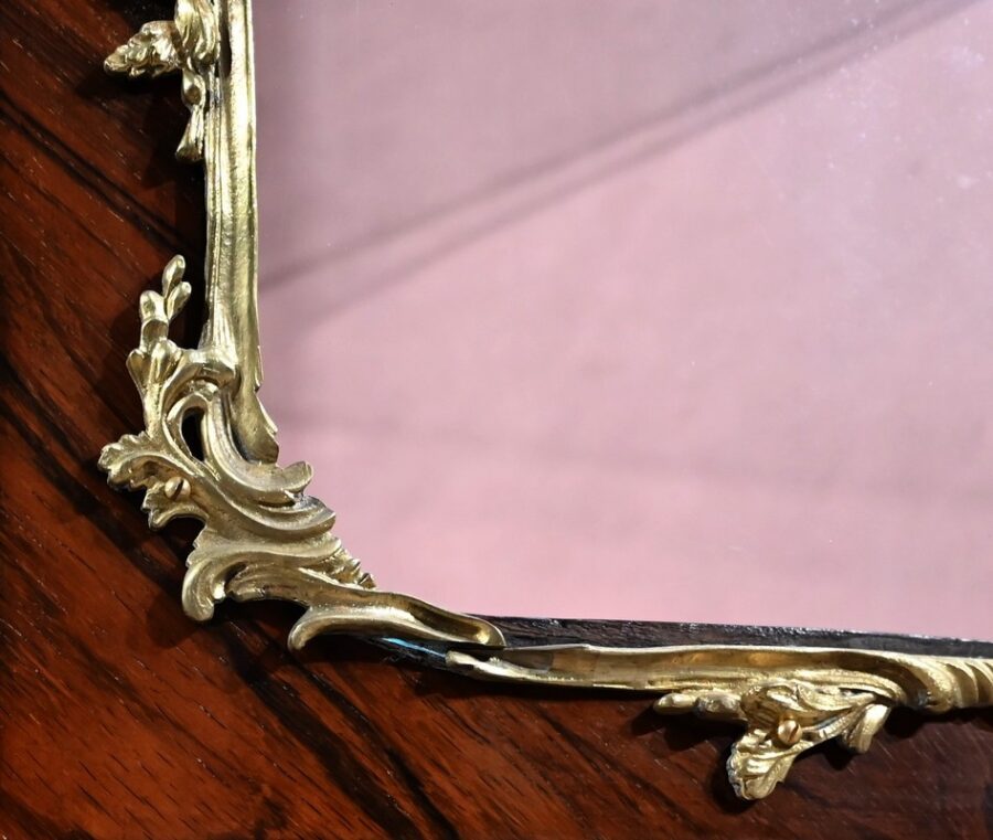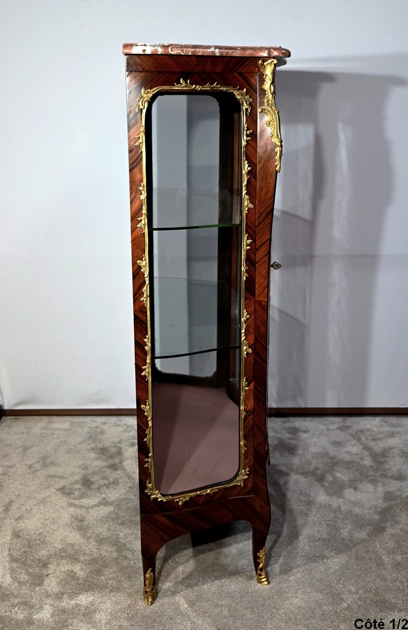 Cette vitrine, sommée d’un marbre rouge des Pyrénées à ressaut et à bec-de-corbin, ouvre par deux portes vitrées légèrement convexes. Leurs encadrements sont en placage de palissandre disposé en diagonale. Ces portes sont munies d’une serrure fonctionnelle d’origine avec clé et entrées laiton finement ouvragées. En façade et sur les côtés, chacune des vitres est soulignée dans son pourtour par une garniture en applique composée de volutes, de pommes de pin et de rinceaux en bronze doré.