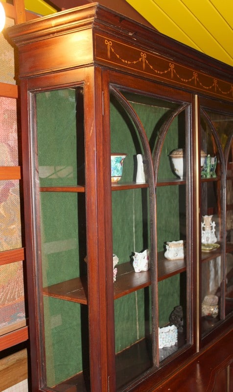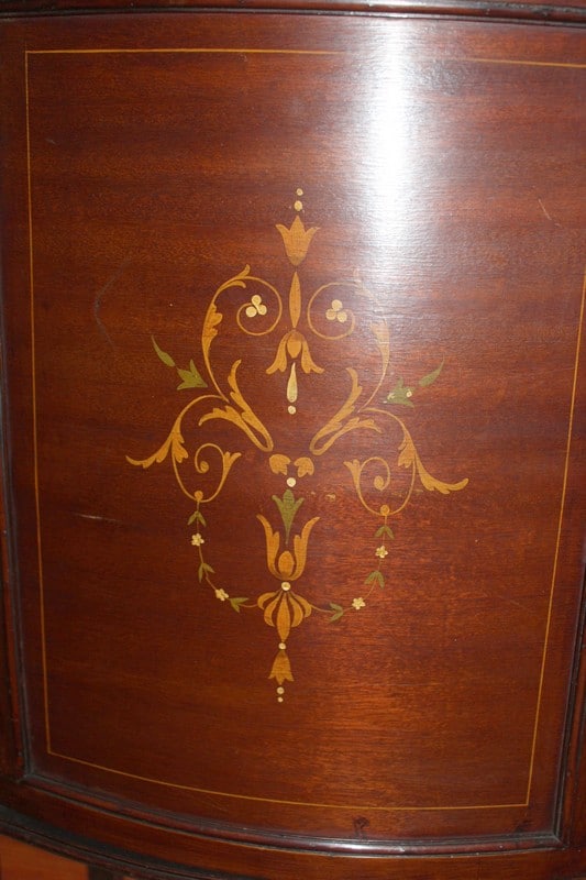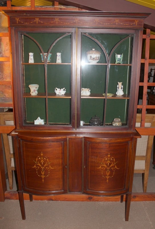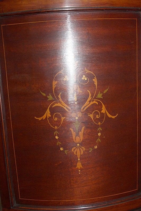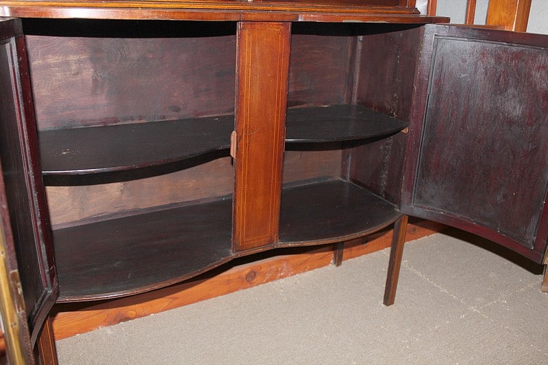 Petite vitrine deux corps en placage d’acajou avec filet de citronnier. Le corps du haut est vitré sur 3 faces et les 2 portes sont à croisillons. Le corps du bas ouvre par 2 portes pleines ornées de marqueterie à décor de fleurs. La traverse haute est également décorée d’une légère marqueterie. Elle repose sur 4 pieds droits et fins.