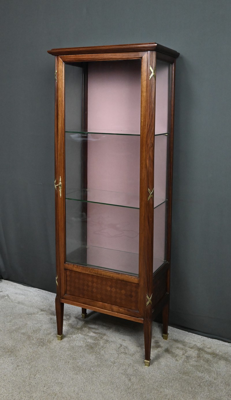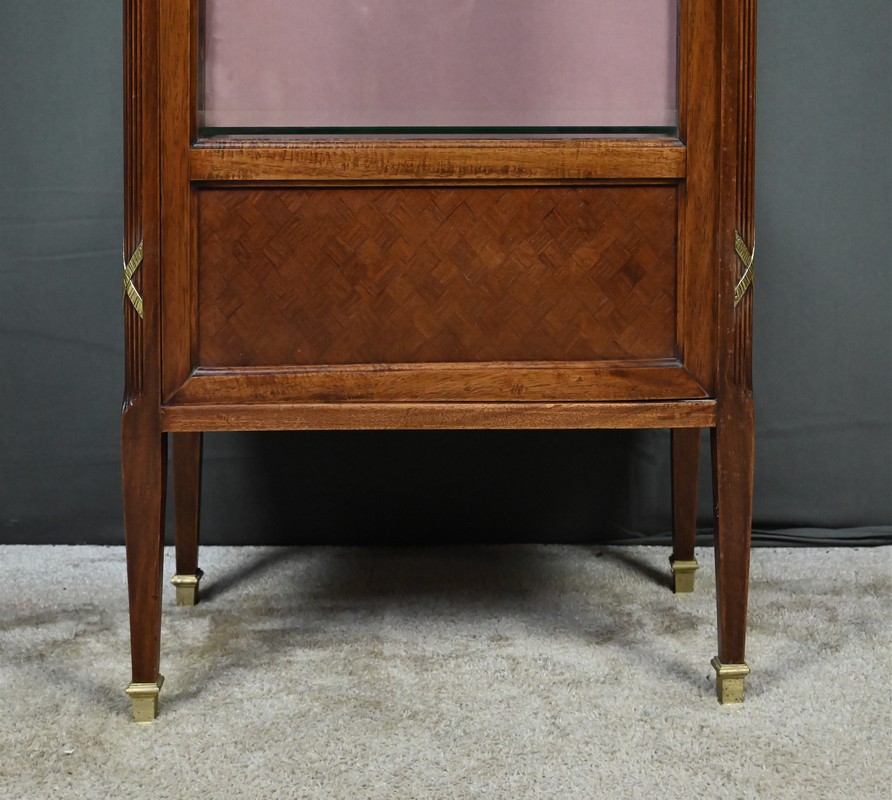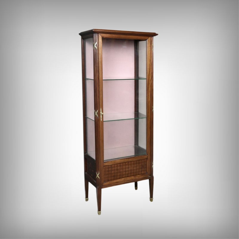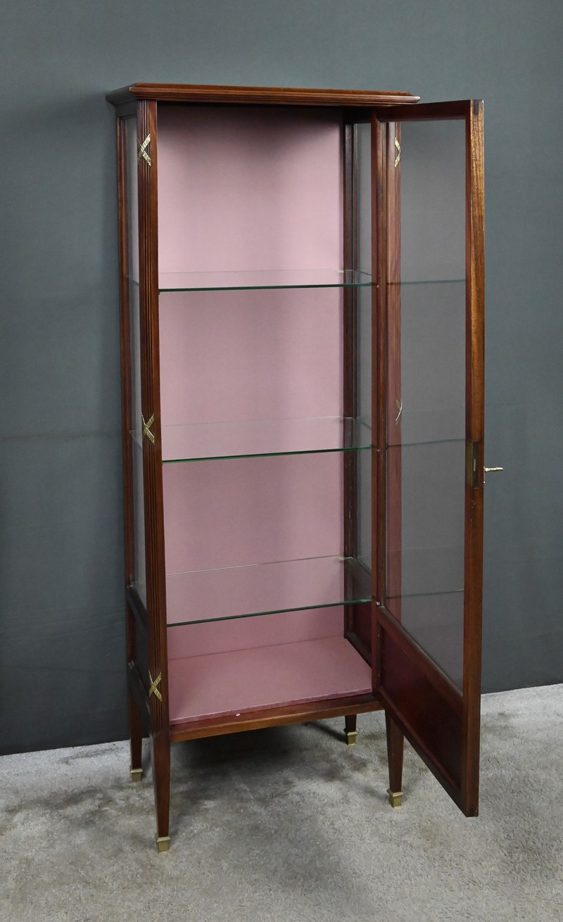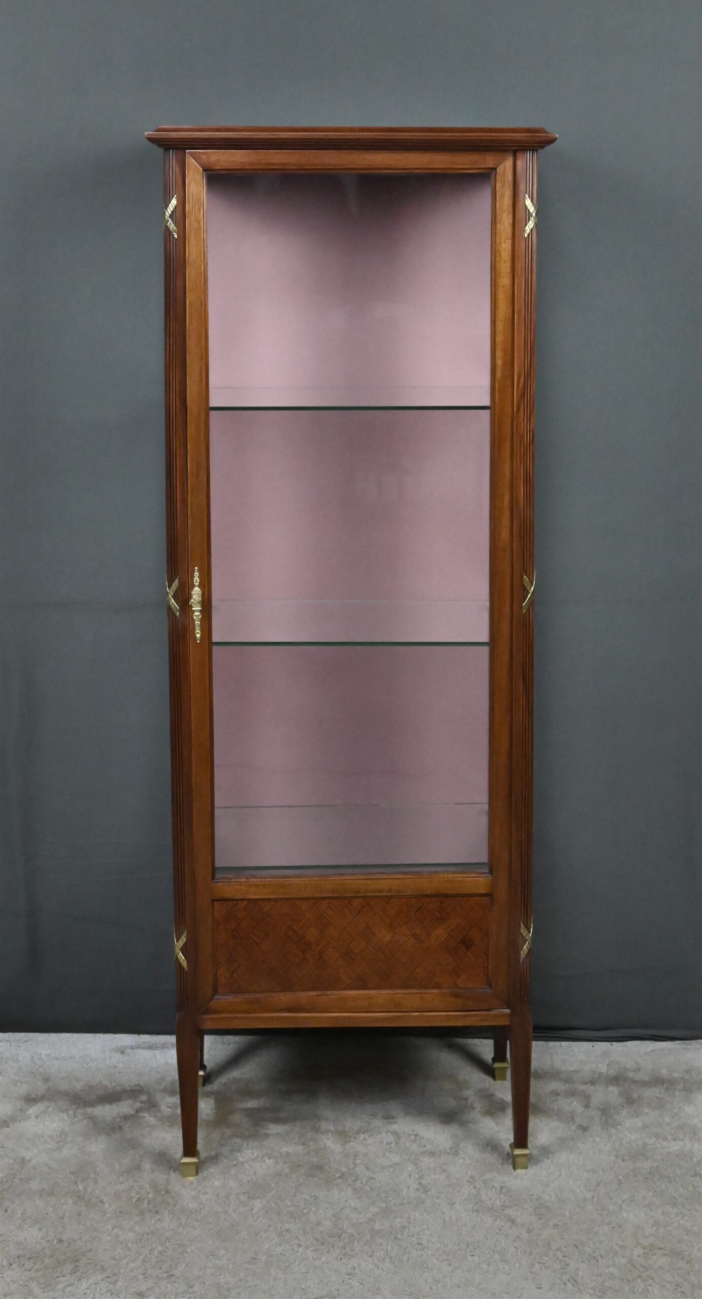 Le dessus présente un plateau mouluré, tandis que les montants cannelés sont ponctués de garnitures martelées formant des croix. Ils reposent sur des pieds fuselés terminés par des sabots en laiton. L’intérieur, garni d’un tissu rose délicat, accueille trois étagères en verre, idéales pour mettre en valeur objets d’art, porcelaines ou collections précieuses.