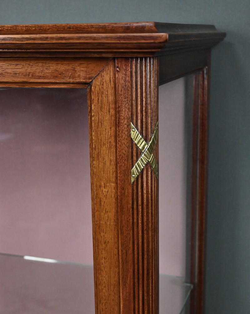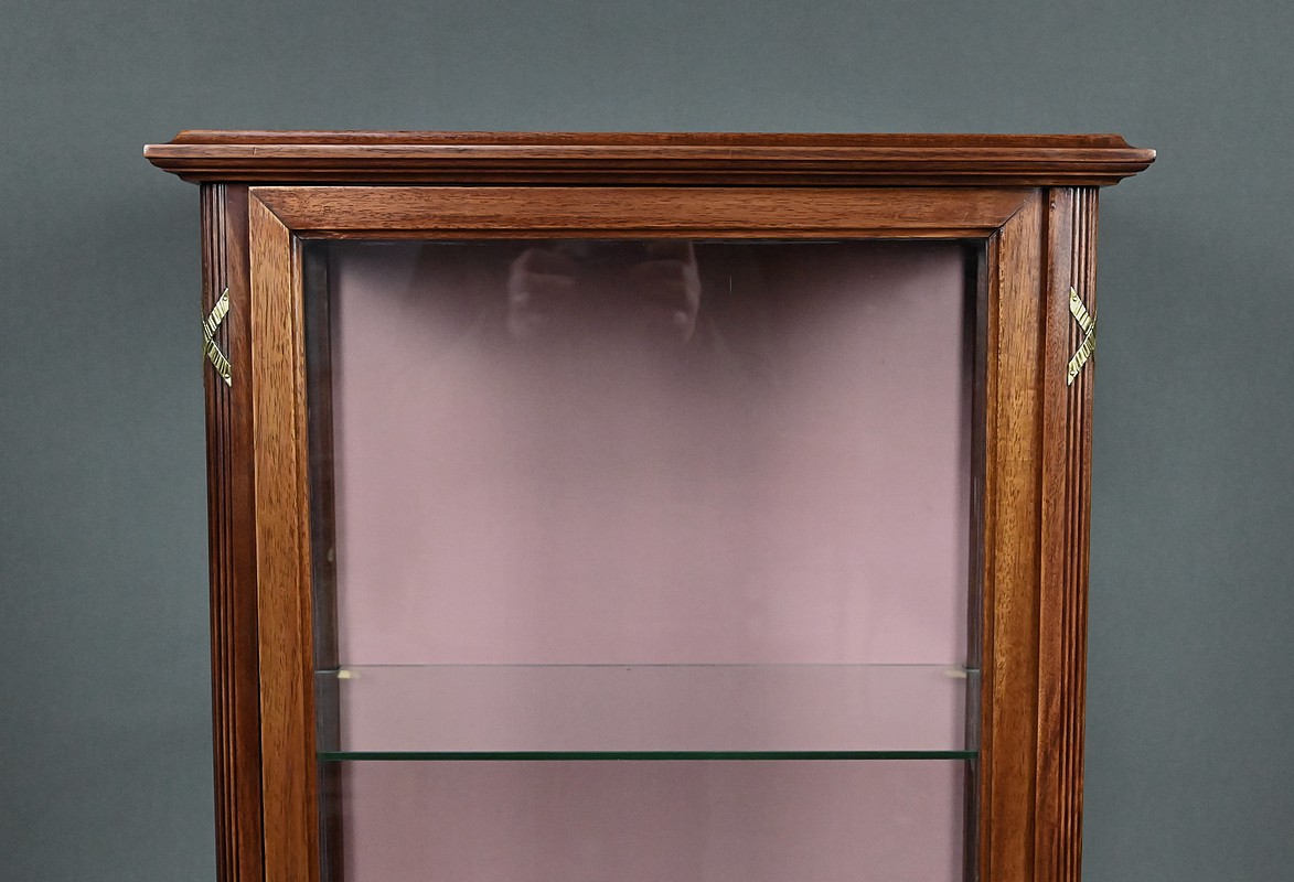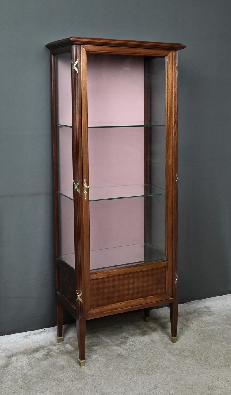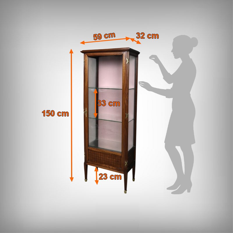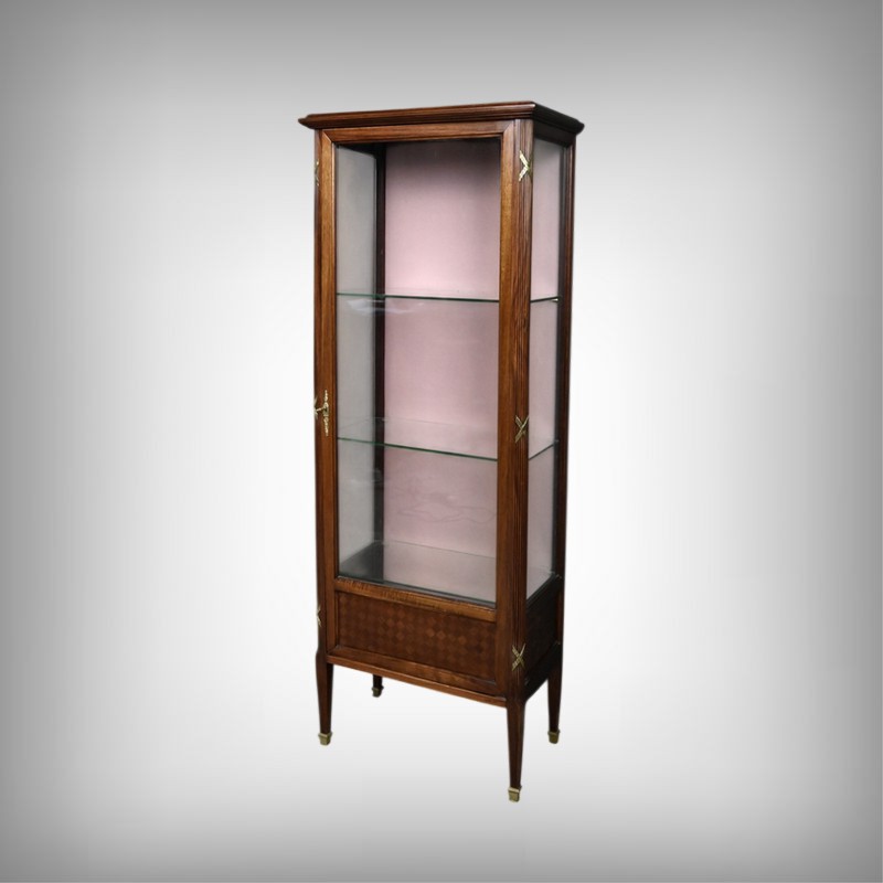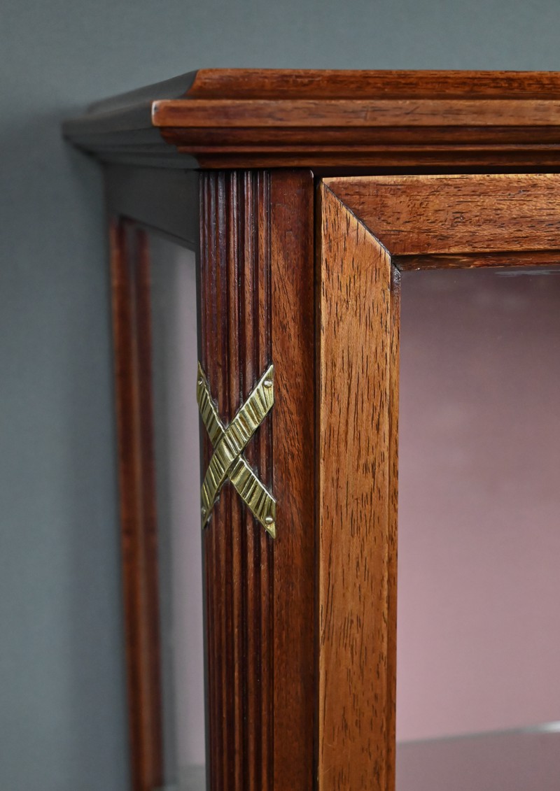 Le dessus présente un plateau mouluré, tandis que les montants cannelés sont ponctués de garnitures martelées formant des croix. Ils reposent sur des pieds fuselés terminés par des sabots en laiton. L’intérieur, garni d’un tissu rose délicat, accueille trois étagères en verre, idéales pour mettre en valeur objets d’art, porcelaines ou collections précieuses.