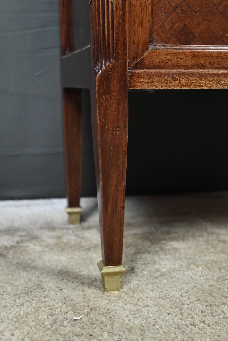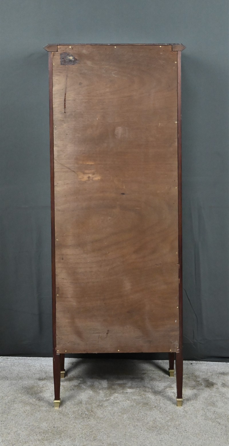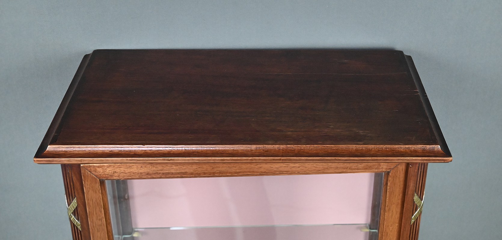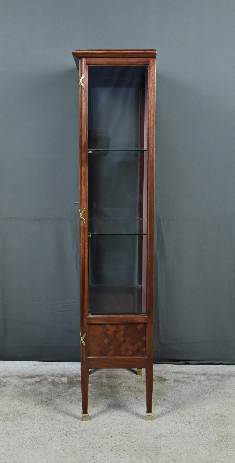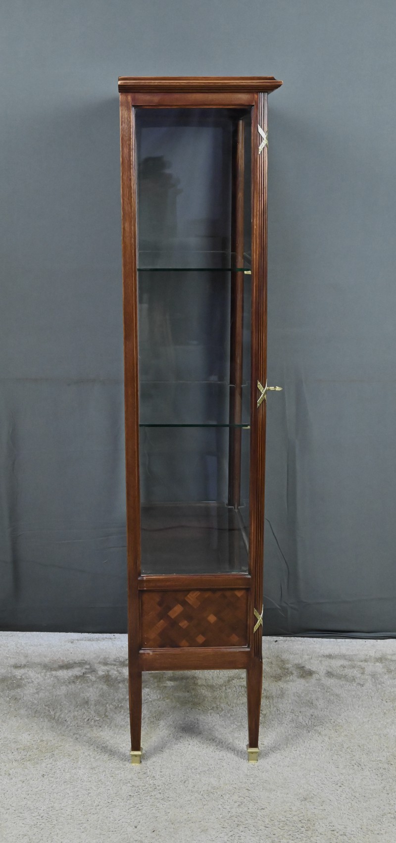 Le dessus présente un plateau mouluré, tandis que les montants cannelés sont ponctués de garnitures martelées formant des croix. Ils reposent sur des pieds fuselés terminés par des sabots en laiton. L’intérieur, garni d’un tissu rose délicat, accueille trois étagères en verre, idéales pour mettre en valeur objets d’art, porcelaines ou collections précieuses.