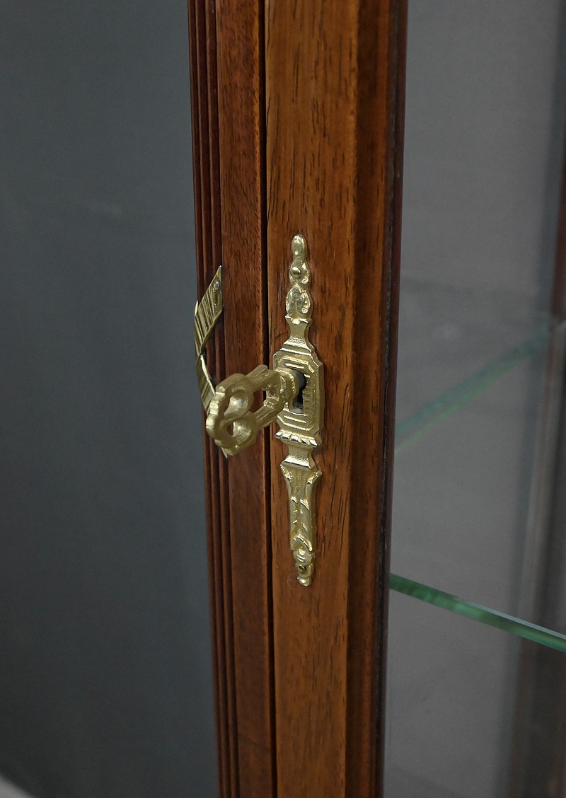 Raffinement et équilibre caractérisent cette vitrine à trois faces vitrées, réalisée en acajou et sublimée par une marqueterie de damiers en partie basse. Elle ouvre par une porte centrale ornée d’une entrée en bronze finement ciselée, accompagnée de sa clé travaillée et d’une serrure parfaitement fonctionnelle.