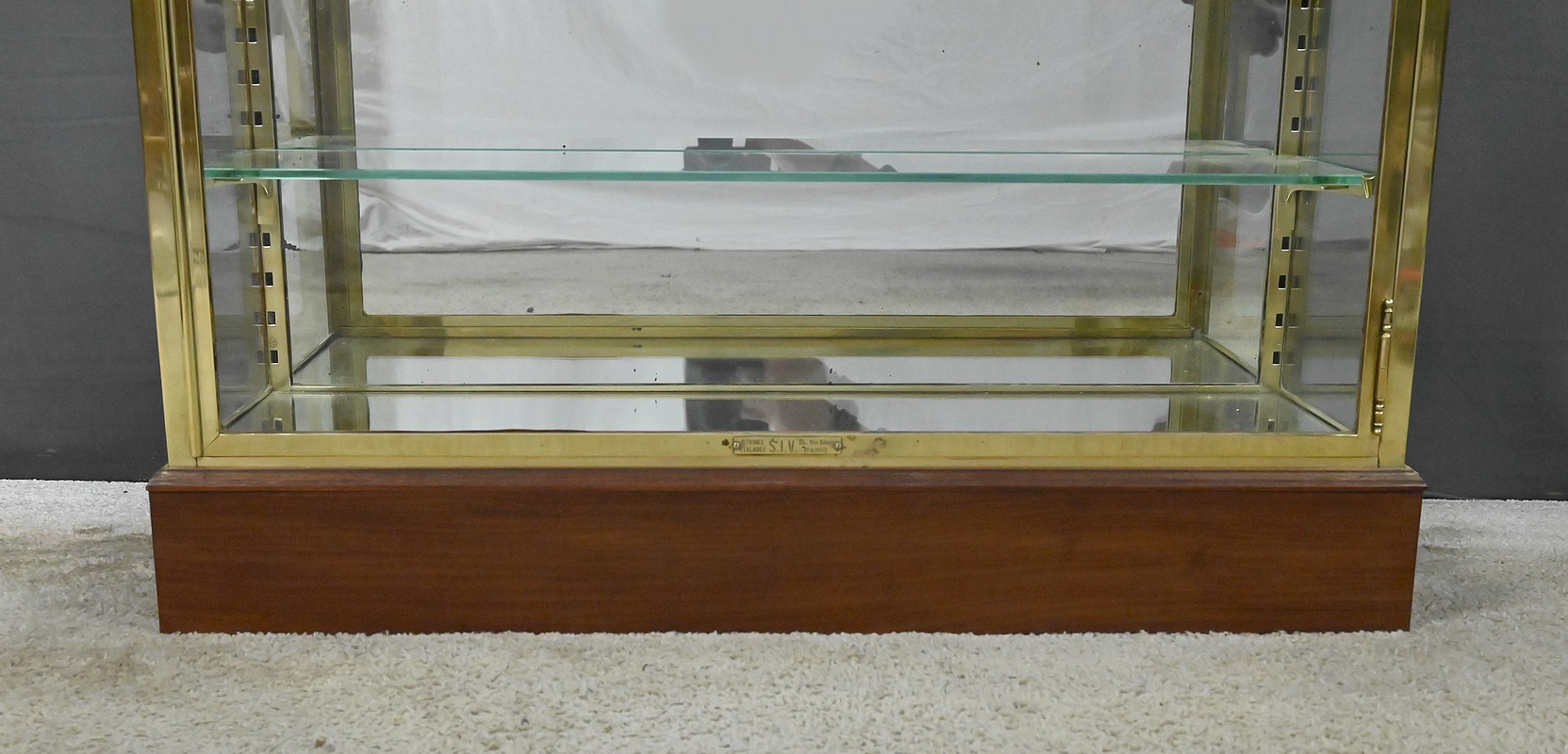 La vitrine repose sur un socle en bois, apportant stabilité et contraste, et s’orne en partie basse d’un cartouche d’origine portant la signature de son fabricant : S.I.V – Vitrines & Étalages, 25 rue Albouy, Paris. Une adresse emblématique qui ancre cette pièce dans la tradition parisienne des vitrines professionnelles de haute qualité.