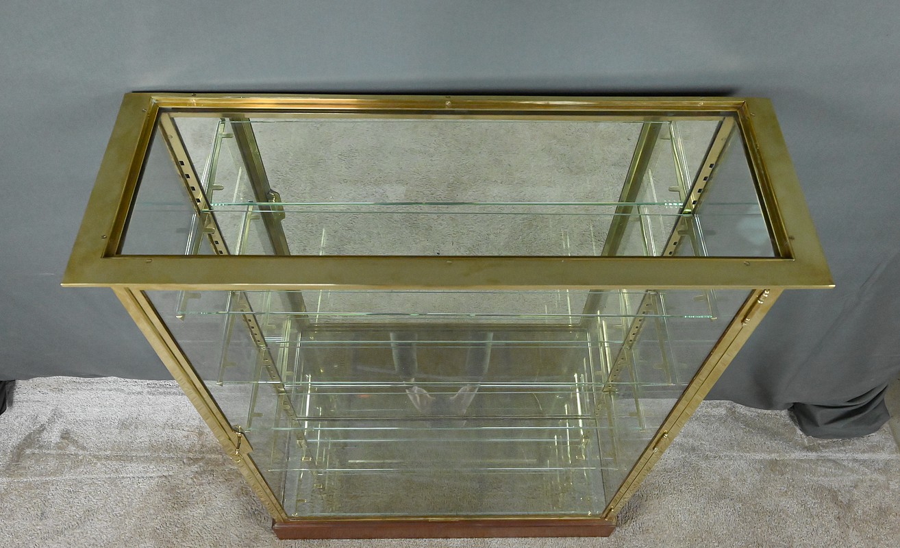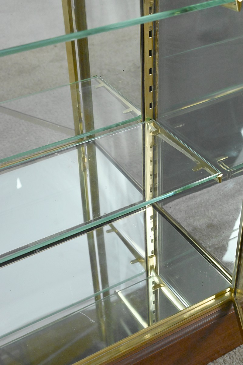 Entièrement vitrée sur les côtés, elle offre une luminosité optimale et une visibilité totale des objets exposés. Le fond et la base sont garnis de miroirs, amplifiant la profondeur et magnifiant chaque pièce présentée. À l’intérieur, quatre étagères en verre réglables sur crémaillères permettent une mise en scène modulable. Elles sont soutenues par de solides équerres en laiton qui prolongent l’esthétique raffinée de l’ensemble.