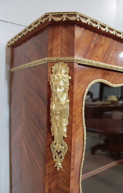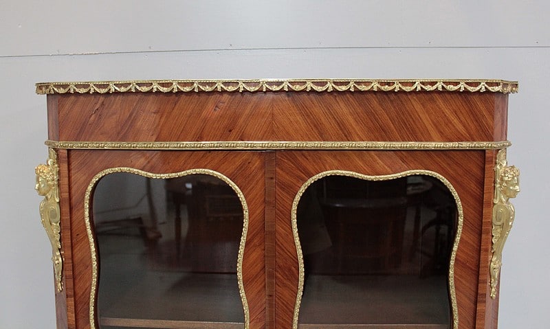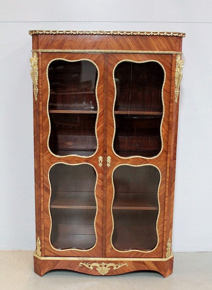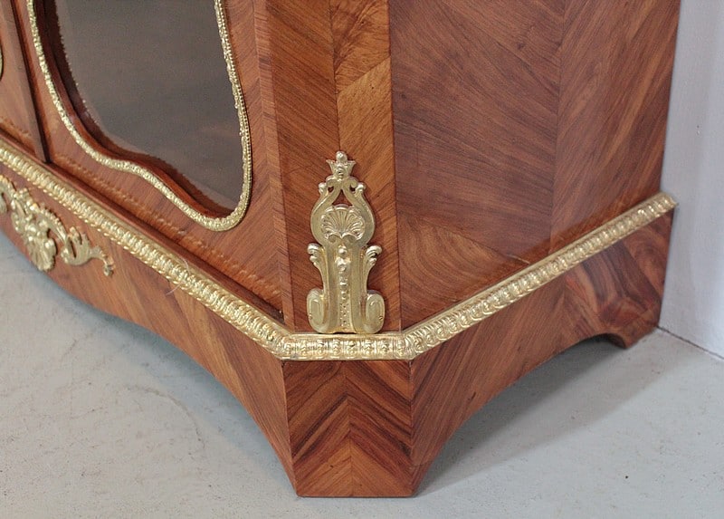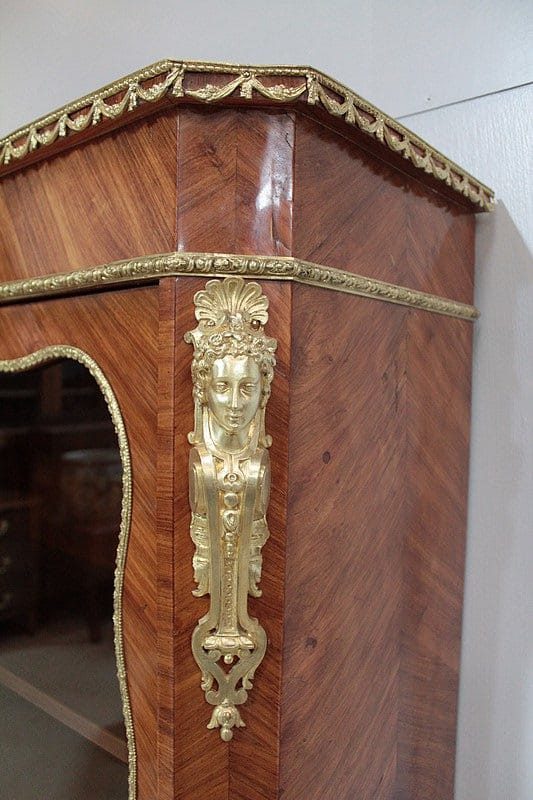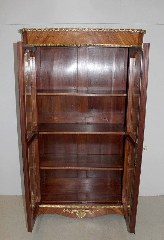Vitrine de style Transition Louis XIV – Louis XV en marqueterie de Bois de Rose. L’intérieur est en placage d’acajou et les 3 étagères en acajou massif.