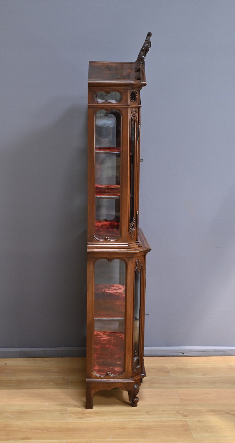 La corniche moulurée, en chapeau de gendarme, est surmontée d’un fronton spectaculaire, orné d’une grande coquille sculptée entourée de volutes élégantes. Ce détail architectural donne à cette vitrine une allure majestueuse. Le meuble est entièrement vitré sur ses faces, ce qui permet une mise en valeur optimale de son contenu. Il s’ouvre par deux portes vitrées en partie haute et une porte en partie basse, toutes équipées de serrures fonctionnelles avec leur clé. Les sculptures abondent sur l’ensemble du meuble, avec des motifs de feuillage et de rinceaux finement travaillés. Les angles à pans coupés, eux aussi vitrés, ajoutent de la légèreté à la structure. Les pieds « escargot » complètent harmonieusement l’ensemble. L’intérieur est entièrement tapissé d’un velours framboise, apportant une touche de chaleur et de raffinement. Les étagères, aux découpes mouvementées, s’inscrivent également dans l’esprit des meubles liégeois. Cette vitrine est idéale pour exposer des objets d’art, de la vaisselle ancienne ou des collections précieuses. Elle allie esthétique, fonctionnalité et histoire, et saura sublimer n’importe quel intérieur.