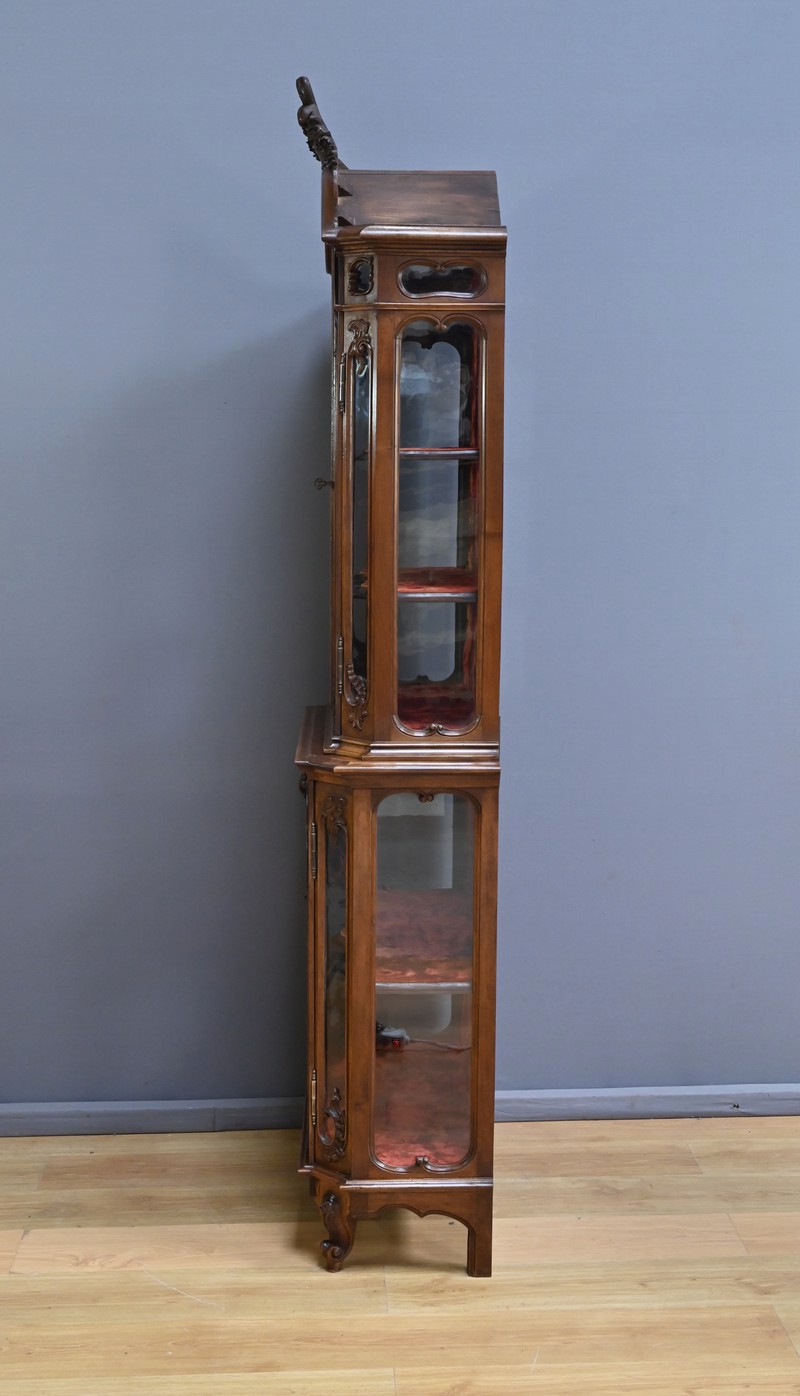 Cette petite vitrine liégeoise deux-corps en noyer, de style Rocaille, est une pièce rare datant de la fin du XIXe siècle. Elle incarne tout le raffinement du mobilier belge de cette époque.
