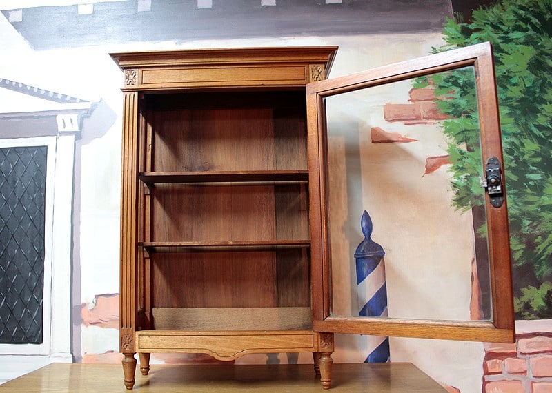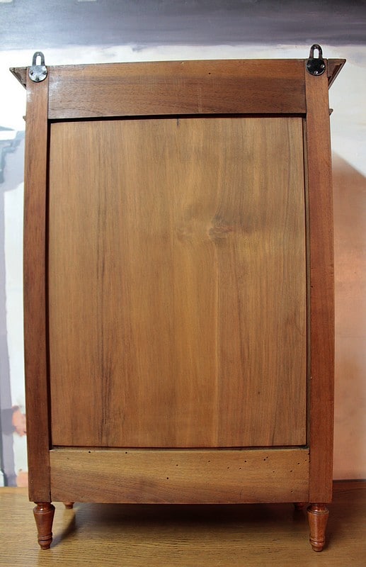 Petite vitrine à suspendre de forme bibliothèque en noyer. Elle est vitrée sur 3 faces et un jonc de laiton entoure chaque vitre. Les montant sont à cannelures et elle repose sur des pieds ‘toupie’ dans le goût Louis XVI.